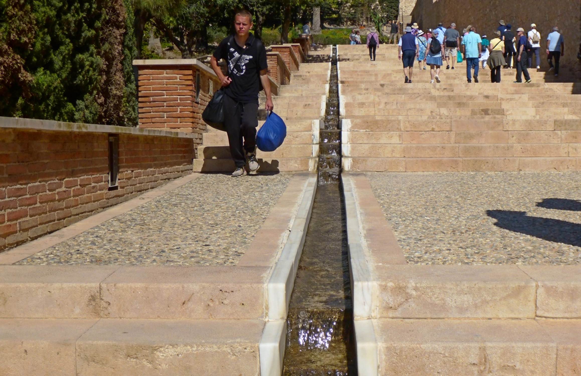 In the photo above, you can see that it is a bit of a climb to the castle entrance, but even after that, there was the equivalent of several more flights of stairs to get up to the main level. Most of the inside of the fortress was well restored, with lots of plants and small gardens. This is a very dry area of Spain and water was considered especially precious when the city and fortress were built, but there were several water features that were apparently included specifically to show how rich and powerful the rulers were: they could even afford to waste water!