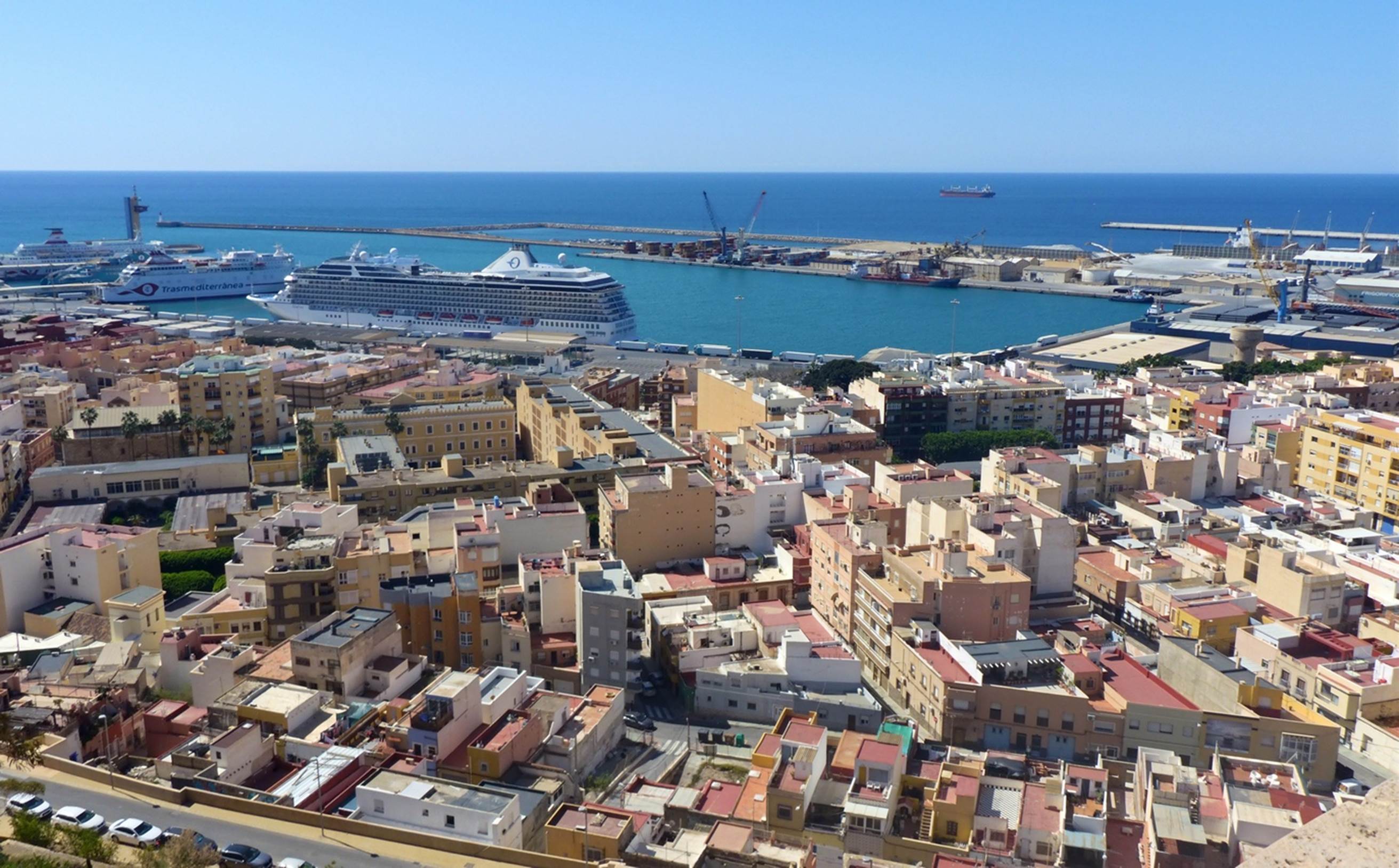 The Marina docked at Almeria at 8:00, while we were enjoying breakfast in the Terrace Café. Almeria is a port city in the Andalusia region of Spain and has a history of being under both Moorish and then Christian rule. The city was established in 955 specifically to serve as a port for the Moorish ruler in the area: I suspect the fortress overlooking the harbor was built as soon as the city was established.