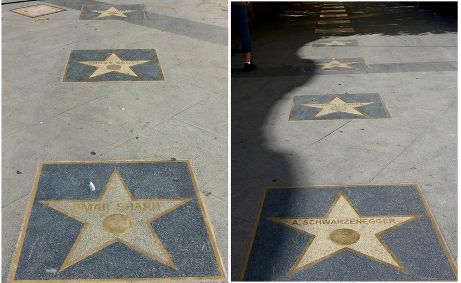 Along one side of the school and leading to the plaza were a pair of parallel sidewalks with rather unique decorations. Similar to Hollywood’s “Walk of Stars”, they had installed a number of stars in the sidewalks with the names of noteworthy actors. If you look closely, you might be able to make out names like Omar Sharif, Ridley Scott, and A. Schwarzenegger in the photos below. I believe that any performer who has acted/performed in this region of Spain is eligible to receive one of these stars.