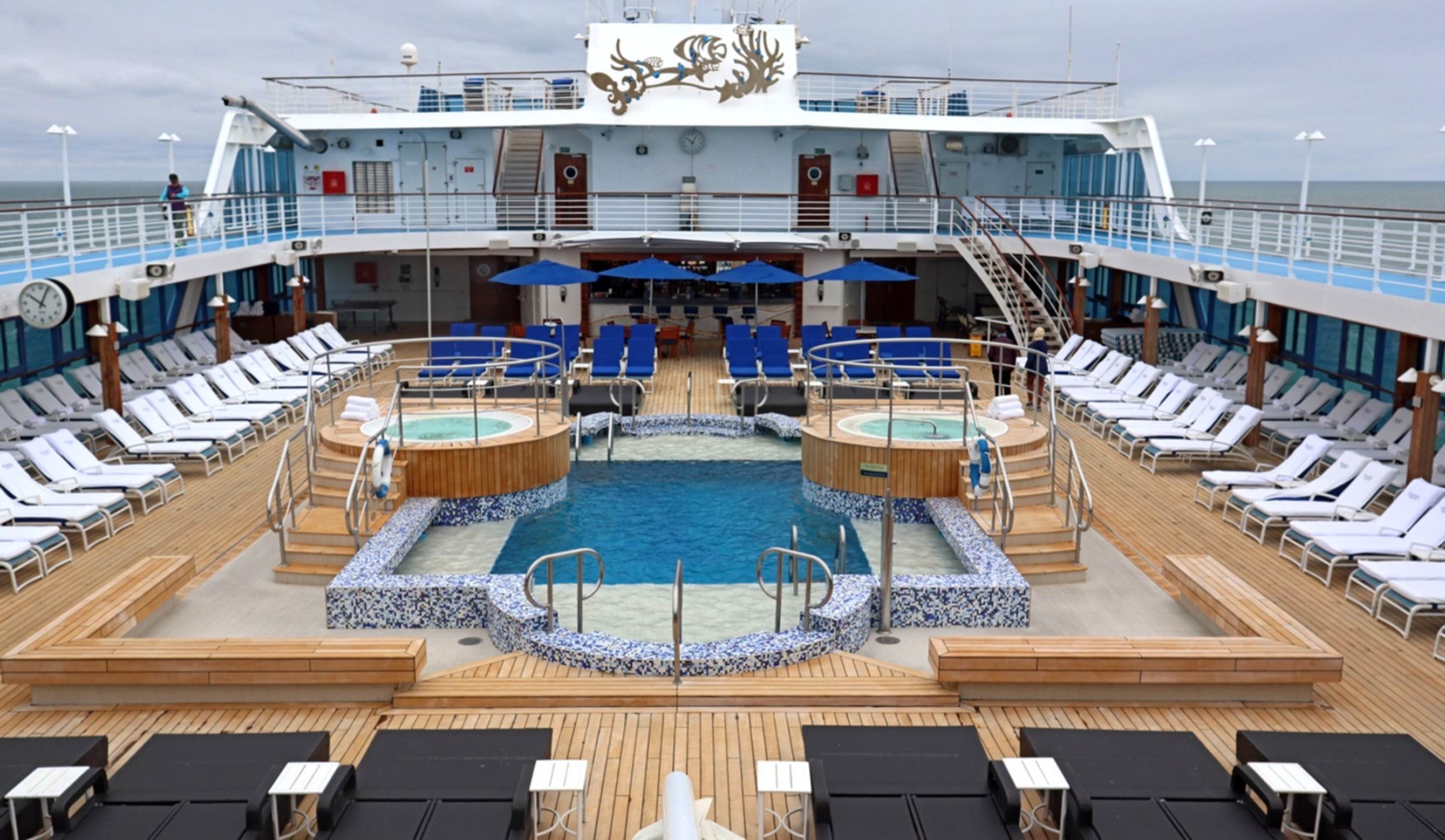 The pool deck is mid-ship, essentially occupying parts of deck 9 with the exercise track circling around the pool, but up on deck 10. Unfortunately, the weather we encountered did not suggest much use of this area. We saw one person in the hot tub one day and Susan saw someone in the pool one time. It would probably be very nice in warm, sunny weather.