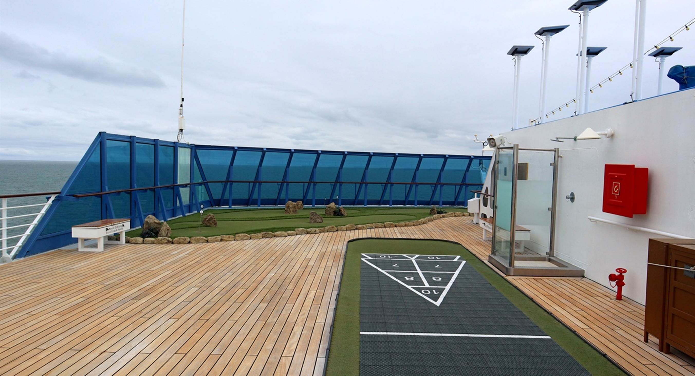 If you continue forward and up one deck from the exercise track you come across the shuffleboard court and a miniature golf style putting green. Many years ago (more than 60) I was pretty good at shuffleboard since we had a court in our yard, but I didn’t get a chance to test my old skills since it was rather cool and breezy in that area of the ship. This video of the pool deck, shuffleboard, and putting green will give you some idea of how it looked, as well as the wind.