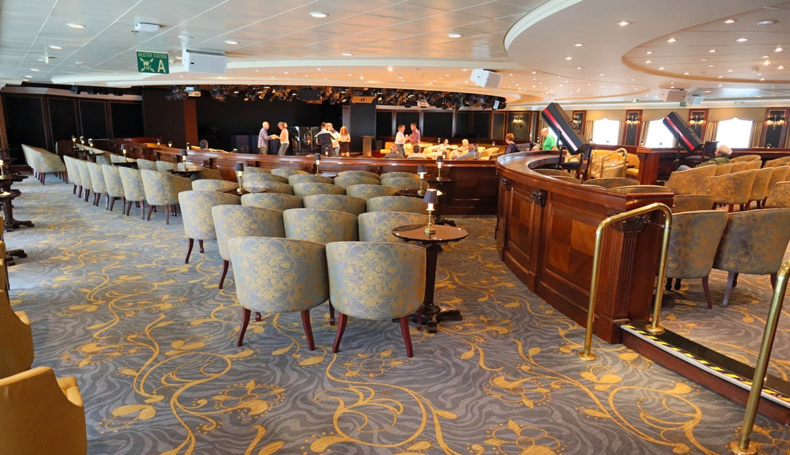 Just below the putting green, on deck 10, is the Horizons Lounge. This is the largest lounge on the ship and every afternoon there is a 4:00 tea with music provided by the band or string quartet. We happened in here one afternoon and, while very nice, it seemed rather “stuffy” and just not our cup of tea. In the evenings, there would sometimes be live music here before and/or after the main show/entertainment but it did not always seem to happen as scheduled and was very poorly attended. After a couple of attempts, we just skipped it, which is a shame because it really was a nice space that was underutilized.