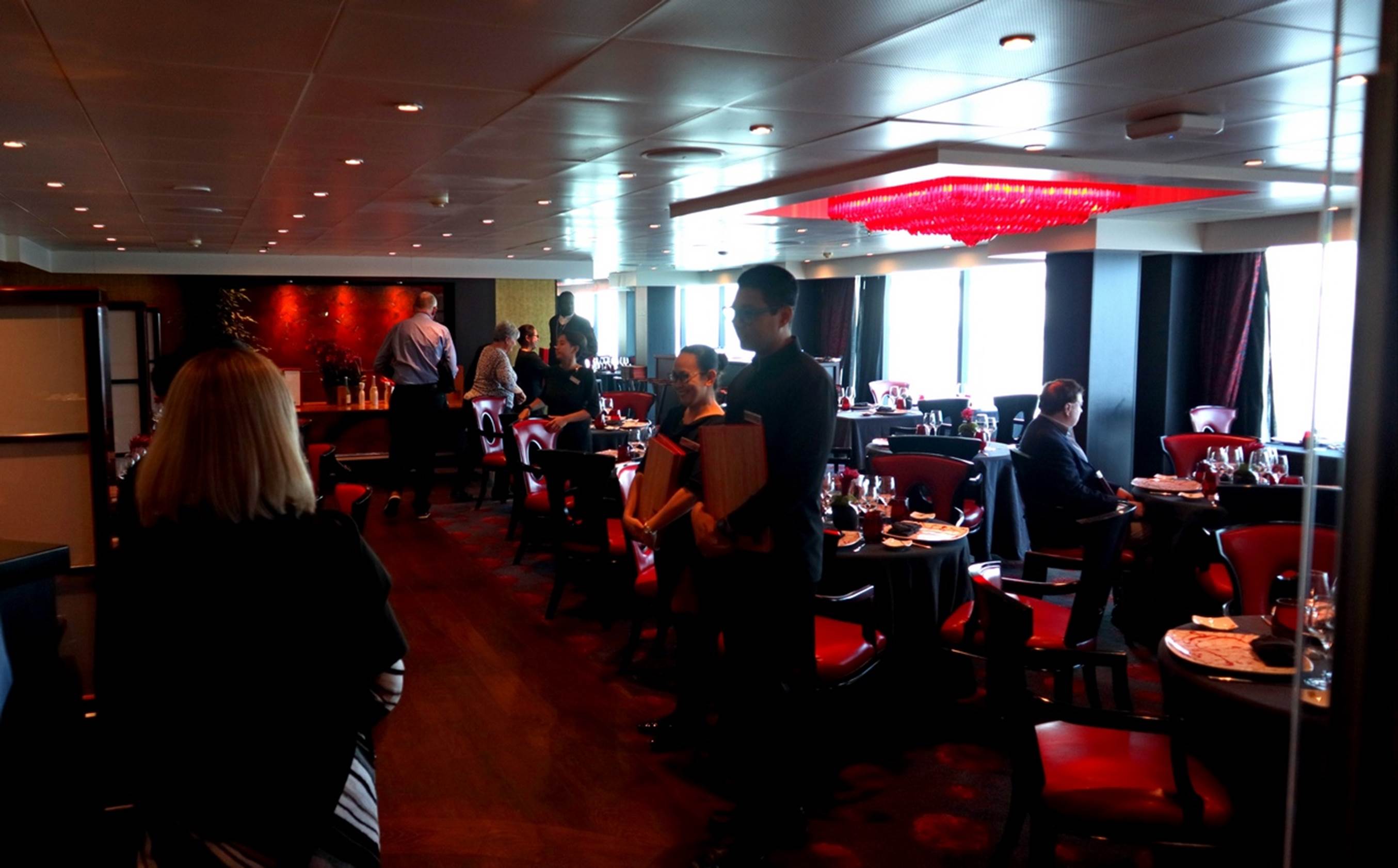 One of the specialty restaurants is the Red Ginger, an Asian fusion themed restaurant, and the Red Ginger theme was carried through to the décor in the dining facility. For our 11-day cruise, we were allowed two visits to the Red Ginger and also to the other specialty restaurant, the Tuscan Steak. Possibly because of their smaller size, service seemed a bit better and more personal than in the GDR and the food was a notch better also.