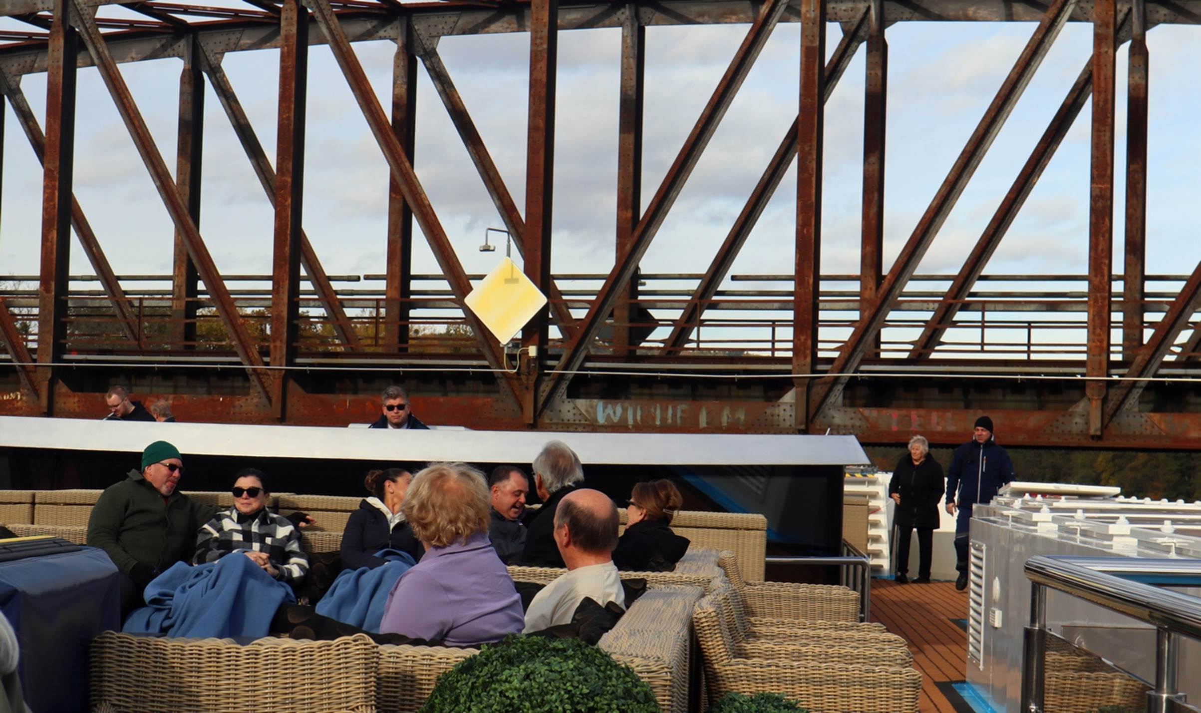 Under a bridge: the captain had to duck his head.
