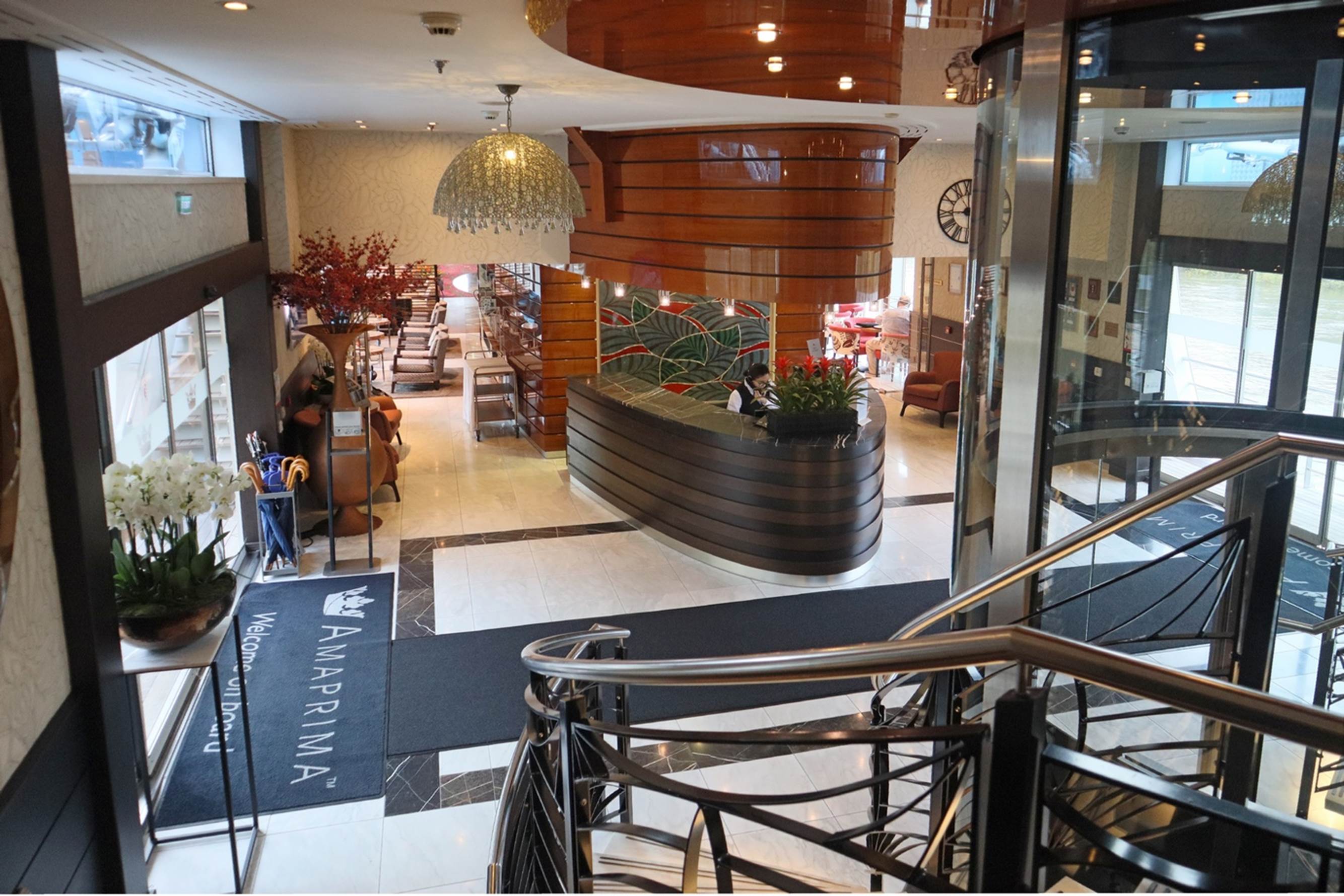 In addition to the upper/exterior decks there were several interior common areas, the first of which and probably the most used was the reception and lobby area in the middle of the boat at the entrance doors.