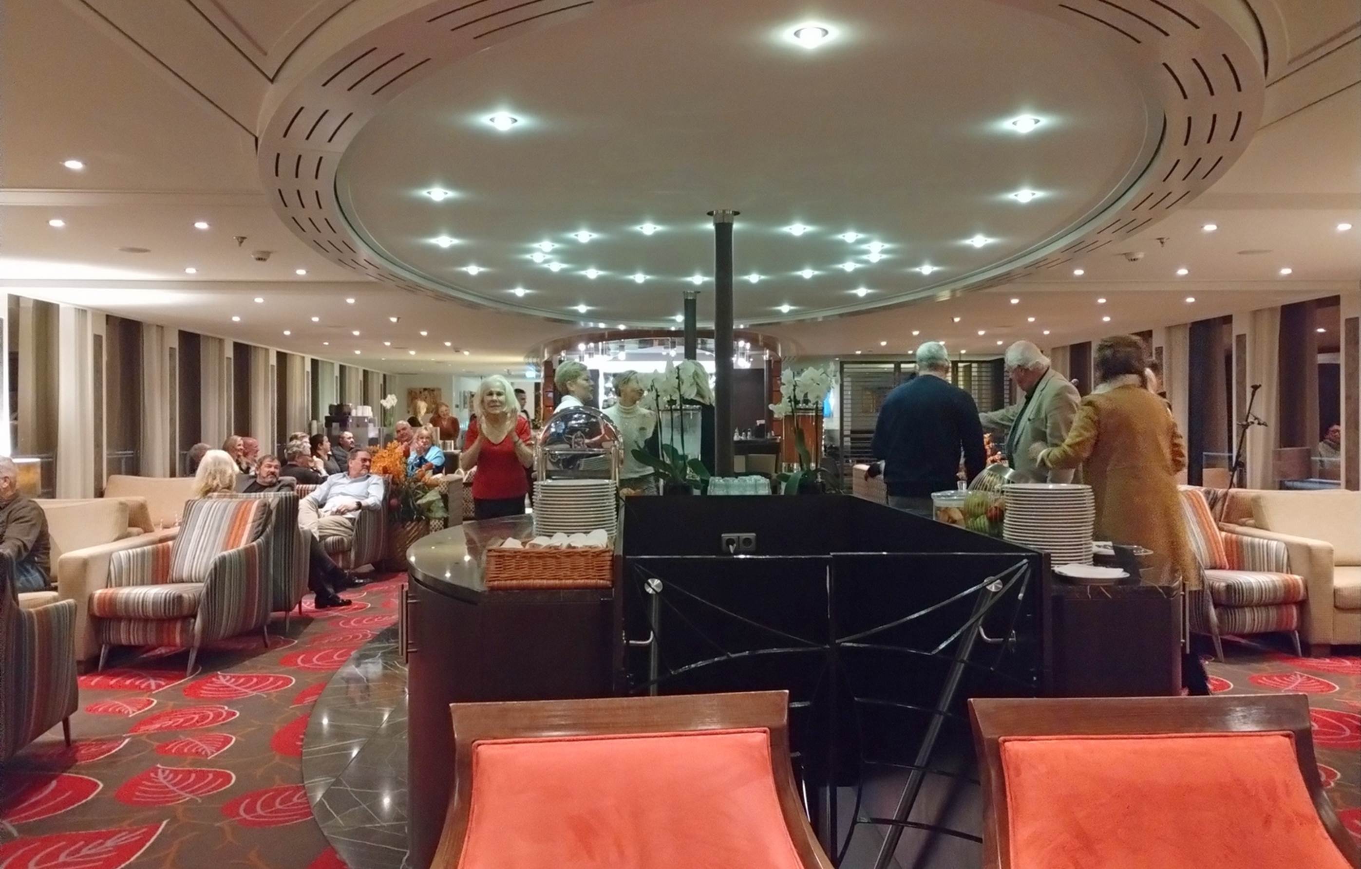 Forward from the reception area is the main lounge and bar on the “Violin Deck”. This is where any meetings, presentations, wine tastings, or other entertainment were held.