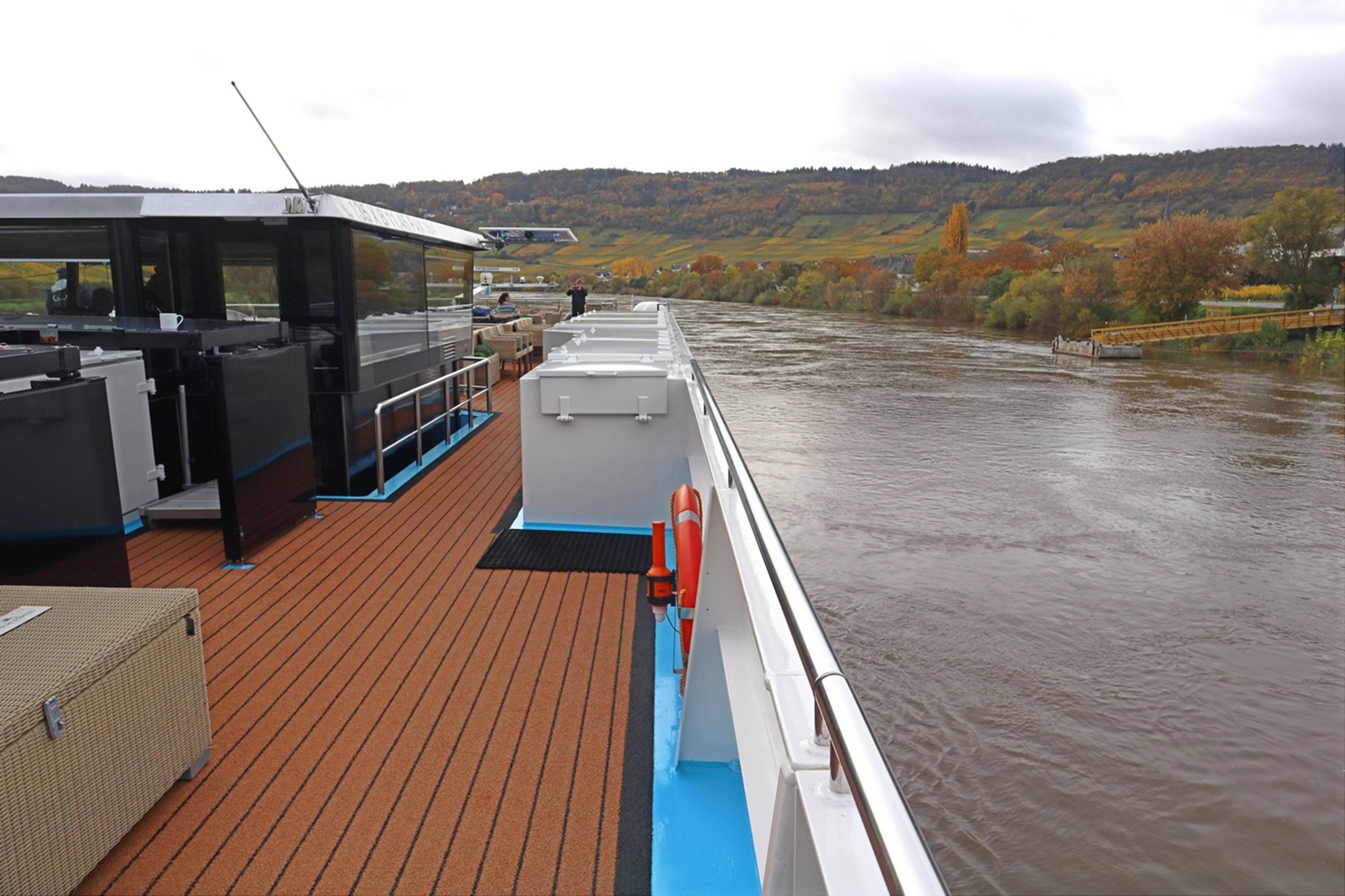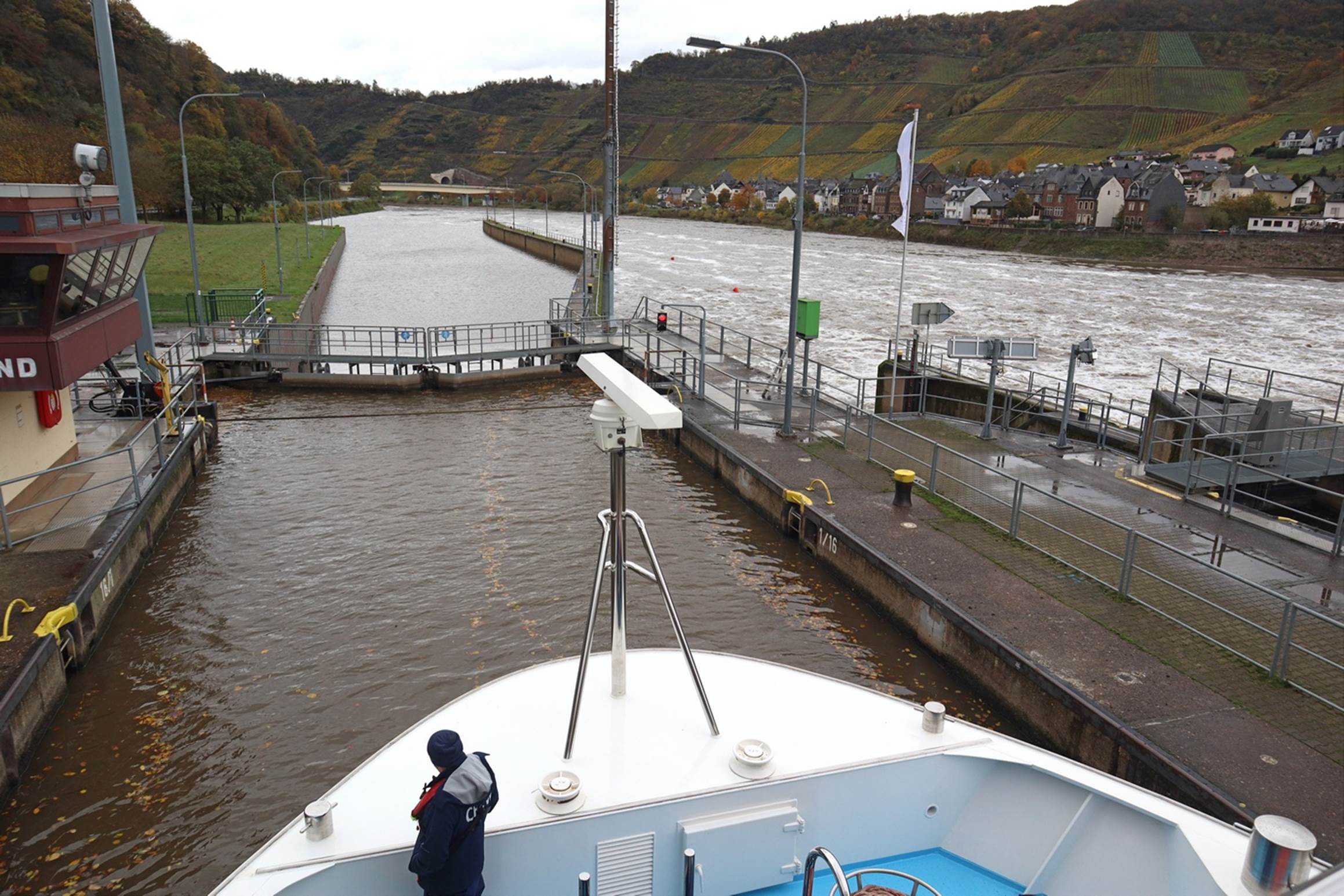 As already mentioned, we experienced quite a bit of rain and the area had been having that rain for some time before we got there. One result is that the water level in the rivers was very high for that time of year. Last year at this time there was a drought and cruises were being heavily modified because of the low water, now we had too much water. The starting point for the cruise was a couple of miles further downriver from Trier because of the current flow. Throughout the cruise, we encountered strong currents and high water, probably at least two feet above the normal river levels. Perhaps we would have had to go through just as many locks in normal water levels, but I suspect we experienced more drastic raising and lowering through the locks. The captain mentioned transiting something like 150 locks on this itinerary, and I believe it. We got used to seeing the inside of rather tall locks: the one in this video was only about a 12 or 15 feet drop, but some were as high as 30 feet.