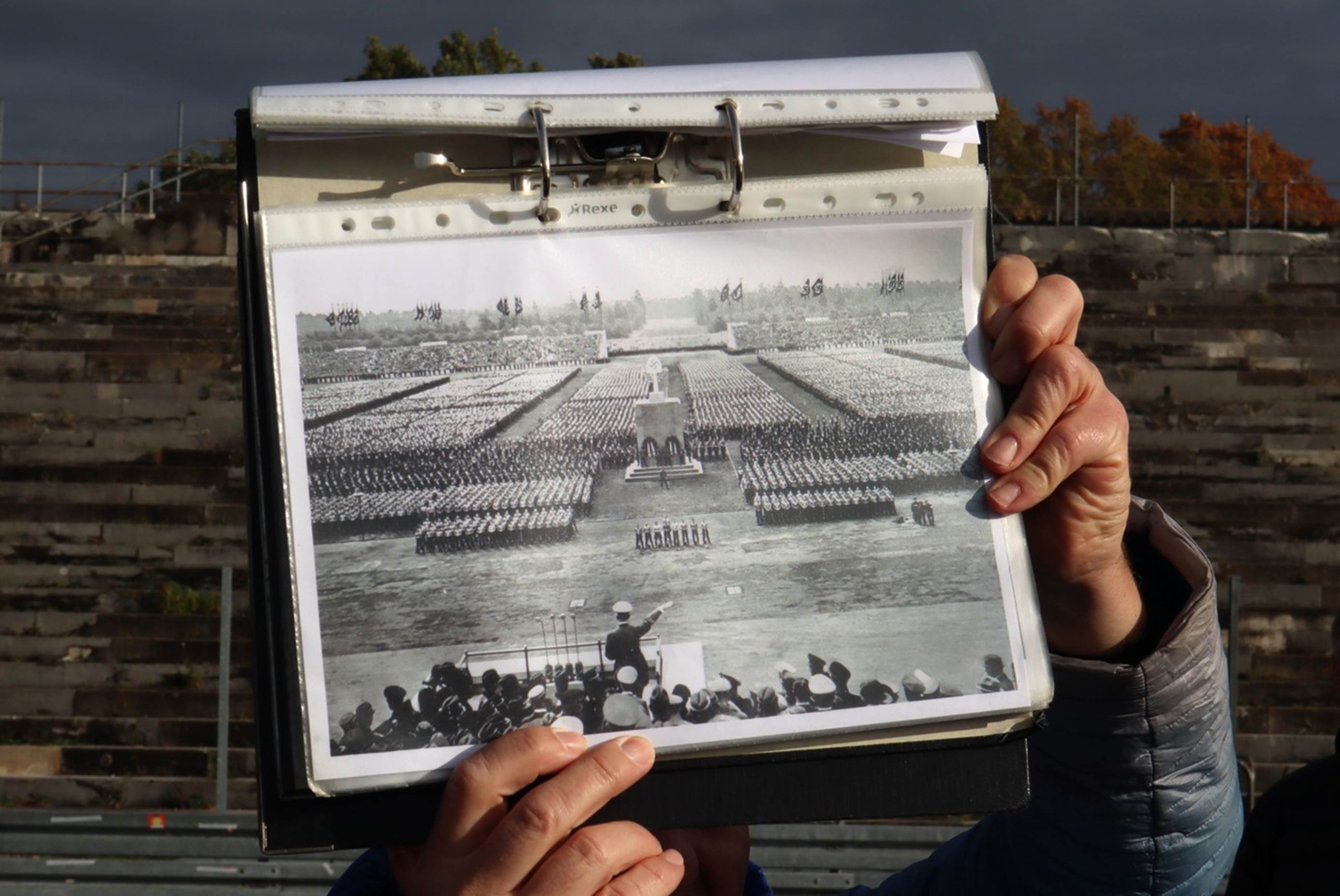 Our guide for the day had brought along a notebook with photos taken at some of the rallies and they showed the large numbers of people who attended these rallies. Nuremberg was considered the “home” of the Nazi party so the annual rallies were held here. Obviously, these rallies were well organized and choregraphed in order to put on such a show to the world. The photo (of a photo) just below shows a view of the rally grounds from high up on the reviewing structure with Hitler standing and reviewing the mass of people in front of him. In the photo above, he would have been standing on the small raised platform with railings around it.