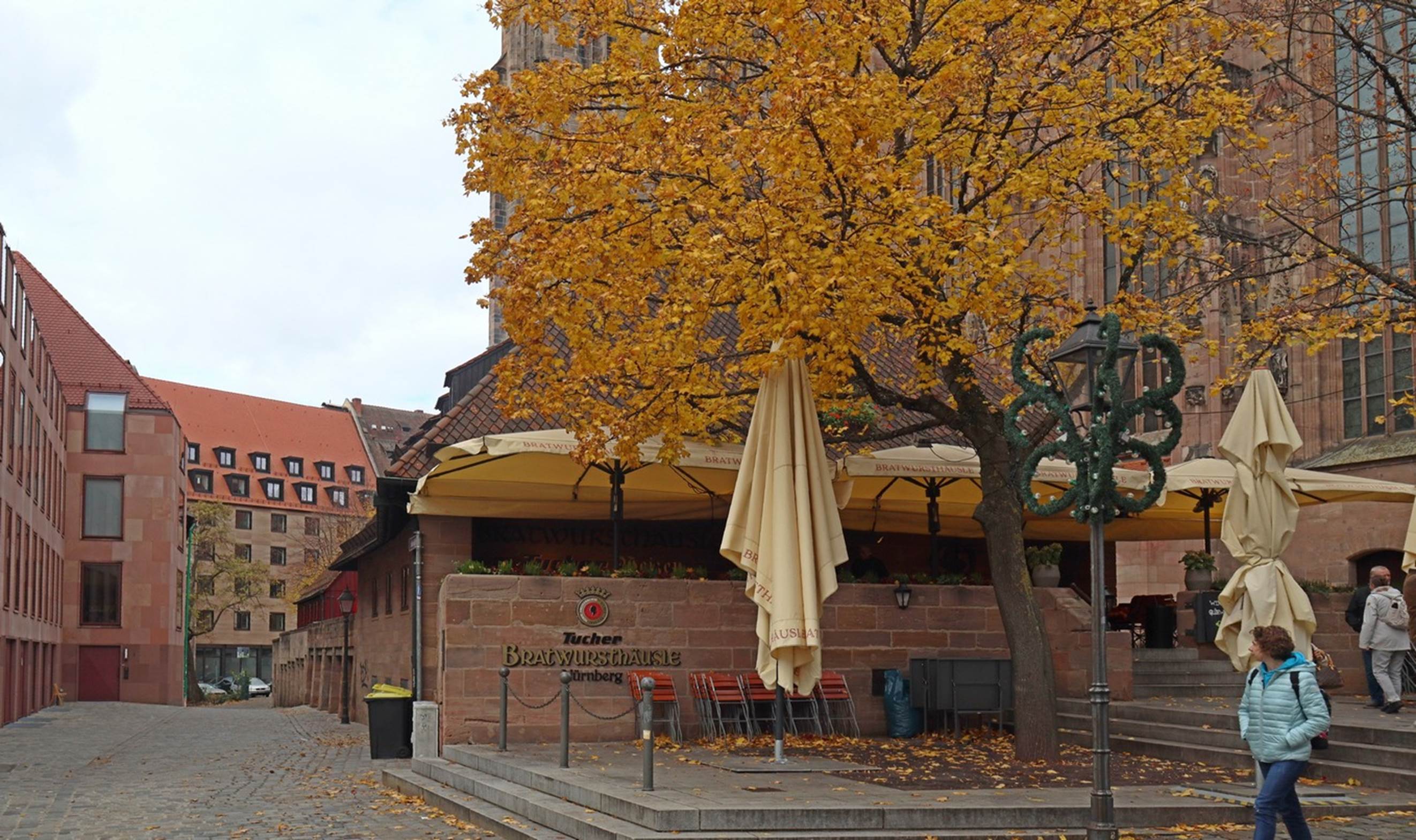 At this point our guide turned us loose to walk around the area as we liked and have lunch at one of several restaurants he pointed out, but we were to return to the square before 12 noon as that is the one time each day that the glockenspiel operates. A small river, the Pegnitz, flows gently through the town with buildings stacked along its edges. We walked over the bridge close to us and explored the area for a while. The main activity appeared to be some workers starting to set up the decorations and facilities for the coming Christmas Market which would be centered in the square.