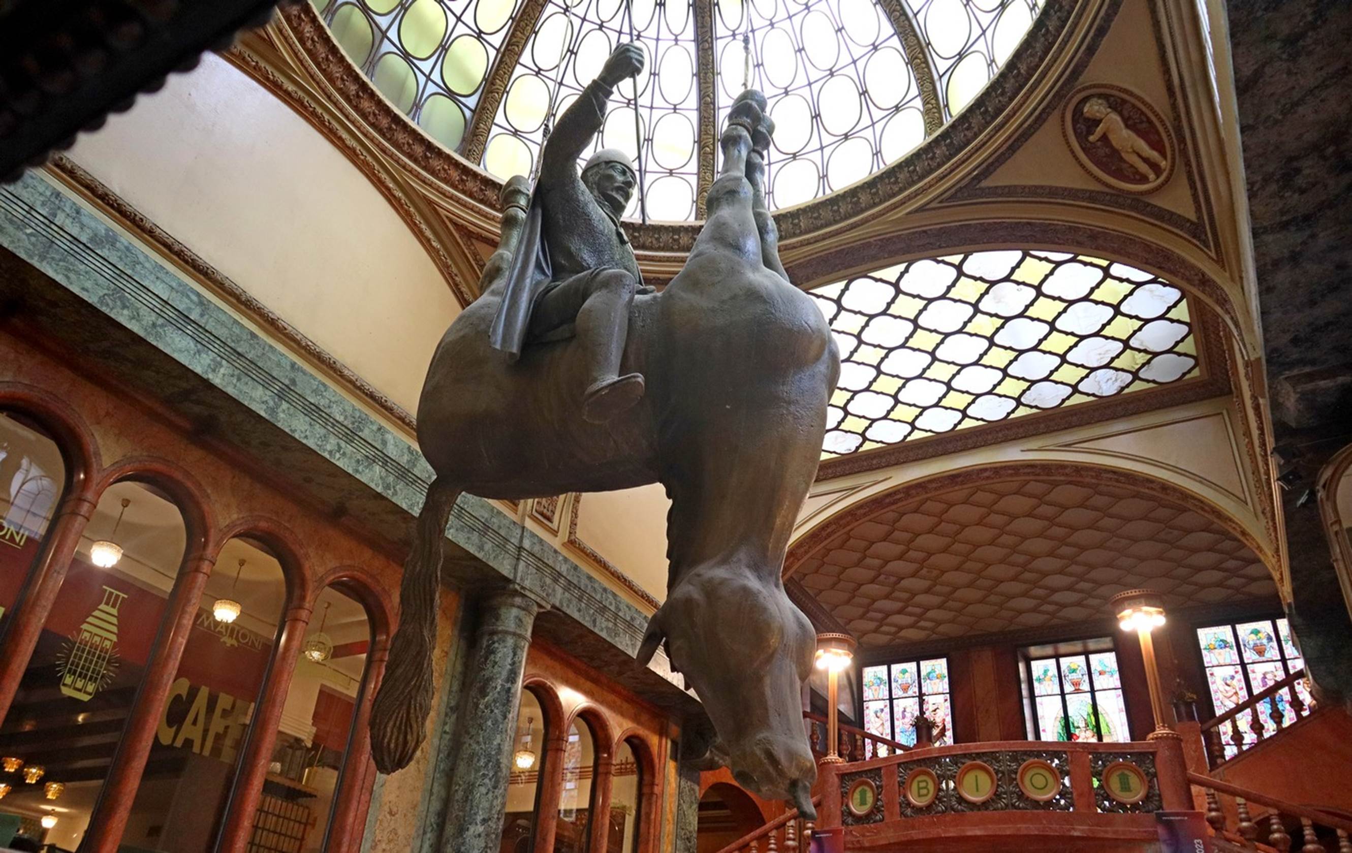Like a couple of days previously in Bamberg, this was to be an active “hike” through some of the most interesting parts of Prague and our guide was a fast walker, although not quite as fast as our Bamberg guide. Our tour got off to an interesting start only about a block from our hotel as we went into a sort of interior shopping mall. The most interesting part, however, was in the atrium area of the mall: an upside-down horse hanging from the ceiling. And, not just the horse, but also a rider seemingly riding on the horse’s belly. The rider is King Wenceslas , the same person for whom the large plaza is named for.