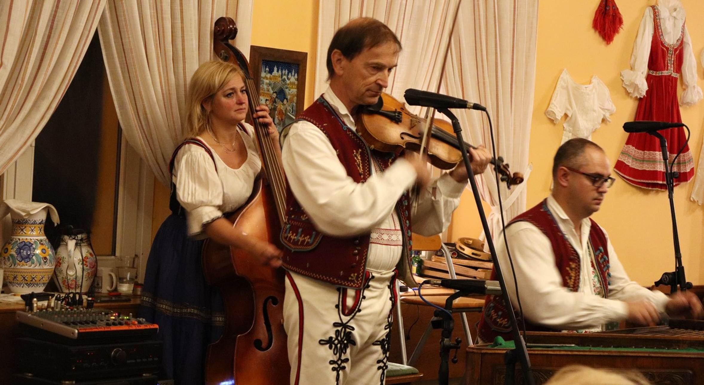 Music and dancing does not lend itself well to normal photo, so this section is going to be “video intensive”, so bear with me. The musicians were really pretty good: here is a composite video of some of their performance. The two dancers did several numbers, both “straight” folk dancing and a couple of silly/comedy numbers. This dance video should give you an idea of both. The musicians also demonstrated a couple of very unusual traditional Czech instruments, one of which reminded me of an Australian Didgeridoo and the other… well, I think you will recognize it if you take a look at this video of the unusual instruments. But the instrument that interested me the most was the one the man was playing while seated: it sounded different than about anything else I’ve heard. At the end of the evening, I went up and asked him what the instrument was called and he said it was a Dulcimer. It did not look or play like any Dulcimer I have ever seen before, but a little research later showed me that it was a “Hammered Dulcimer” and these Hammered Dulcimers come in a variety of sizes, shapes, and complexities. Take a look at this Hammered Dulcimer video and I think you will agree that it is unique.