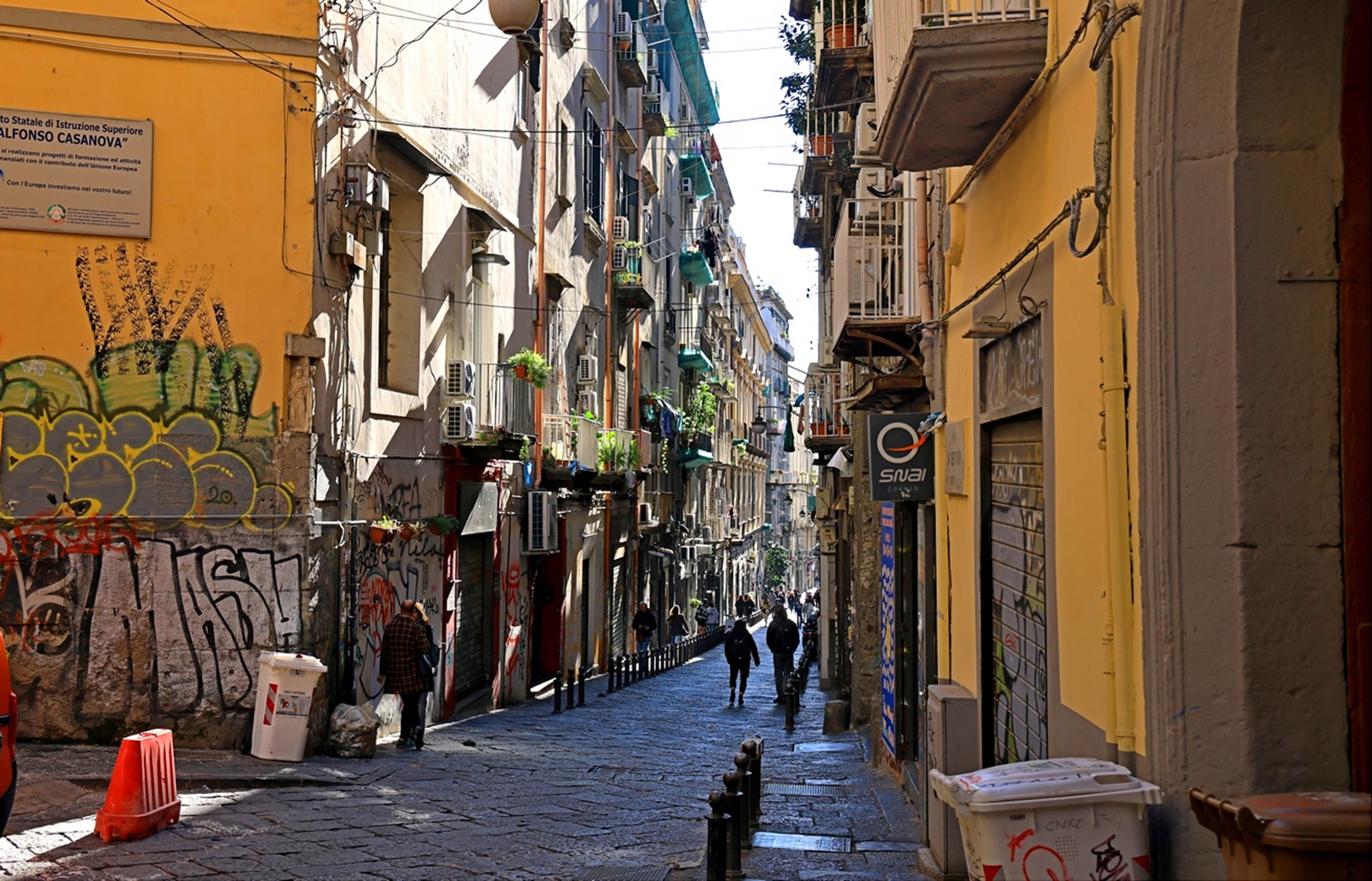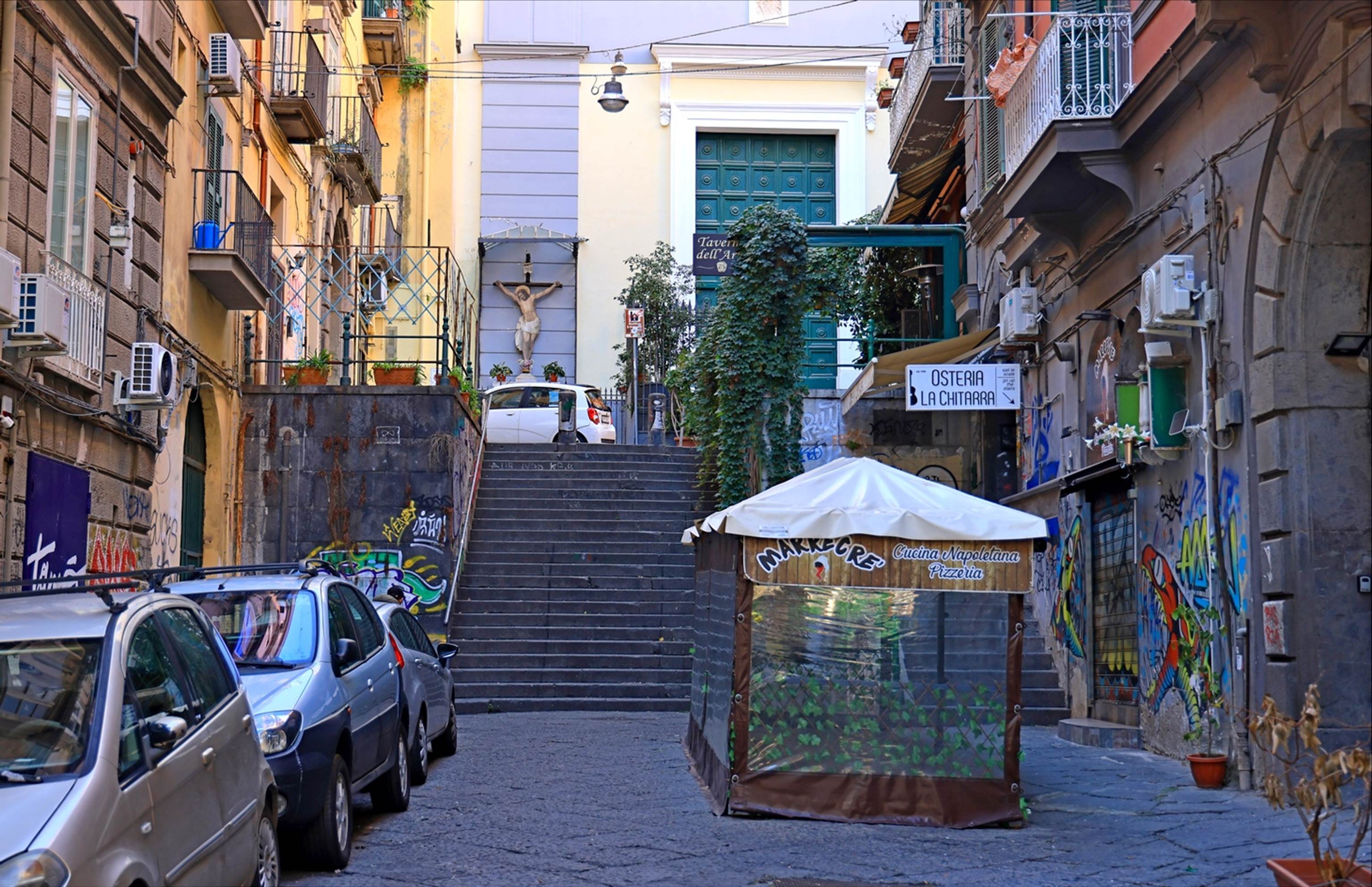 We passed several statues and monuments along the way on the street “Via Toledo”. The one in the photo below, of poet/writer Dante Alighieri, stood out not only because of the size of the monument, but also because of the building behind the monument. The curve of the building (actually an expensive boarding school) provided a “visual frame” around the monument, really setting it off.