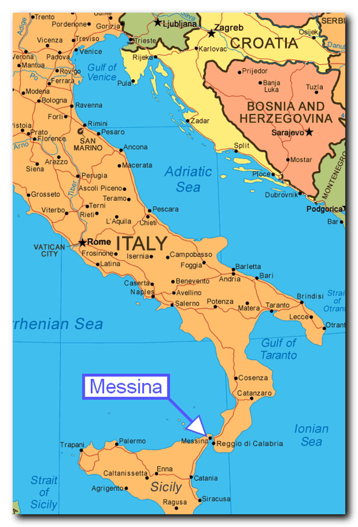 At the 10:15 departure time, about 18 of us climbed into the large tour bus (that will be significant) for the ride to the Gambino winery. We had a pleasant ride with nice views along the way, including some historic sites in Messina, such as the statue above. For much of the first part of the ride, we were on a highway close to the coastline where we could look off to the east and see the mainland of Italy across the strait.