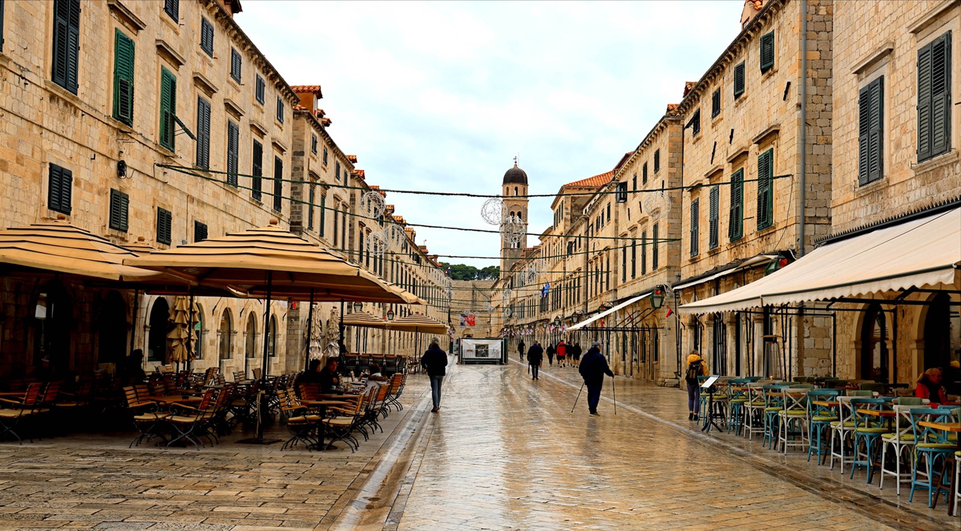 The church faces one end of what is considered the main street in the Old Town, known as the Stratum. Between the off-season and the wet weather, the street was practically deserted: there was no one there! When we visited previously, it was at the end of COVID restrictions and on the “shoulder” of tourist season and there were hundreds of people along this street with probably 5 or 6 different tour groups.