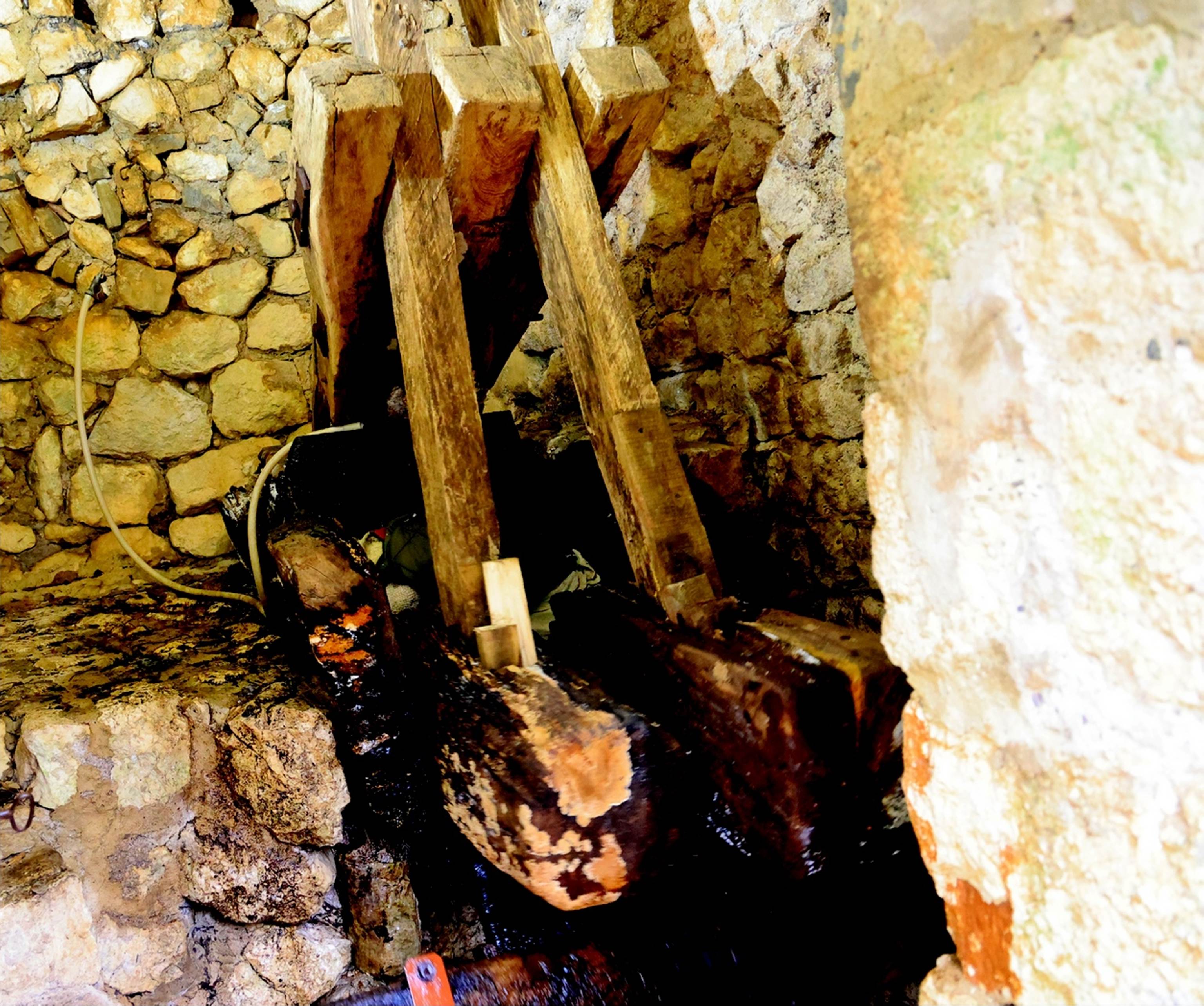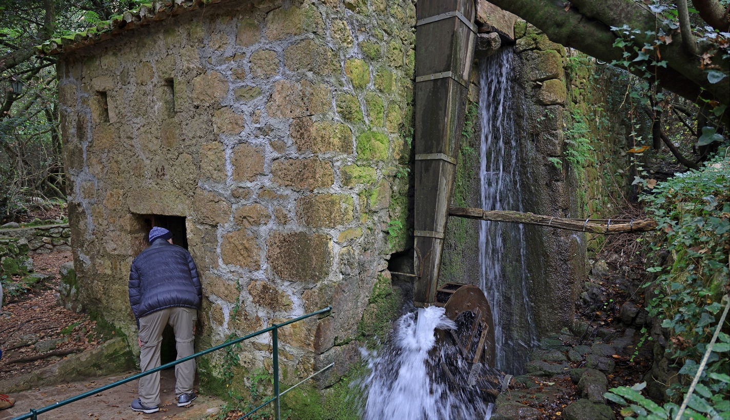 To get a better idea of the mill’s operation, check this short video of the grind stone producing flour. After watching this grindstone and water wheel, we walked upstream a bit to another small building with another water wheel, but this one worked a little differently. It was used somehow (I never really figured out its function) in the production of cloth from wool. In the photo below, note the metal rod attached to the water chute just a little above where the water exits the chute. This rod went inside the building and the person running the equipment could use it to push the water chute out a foot or two so the water no longer hit the wheel, stopping the mechanism.