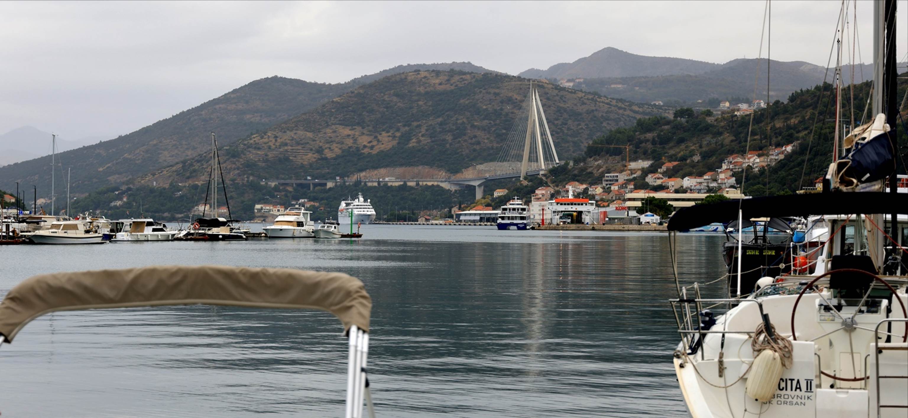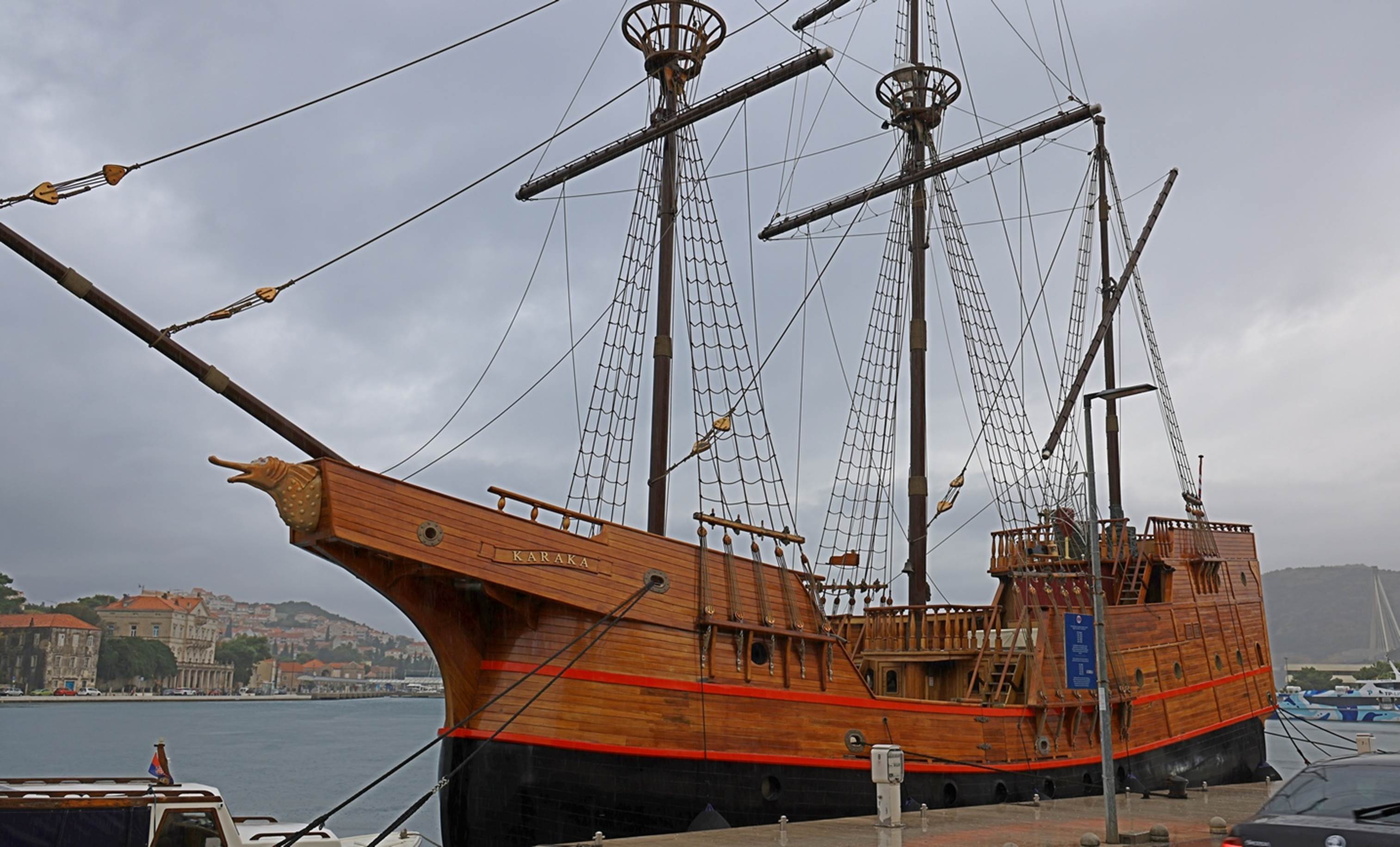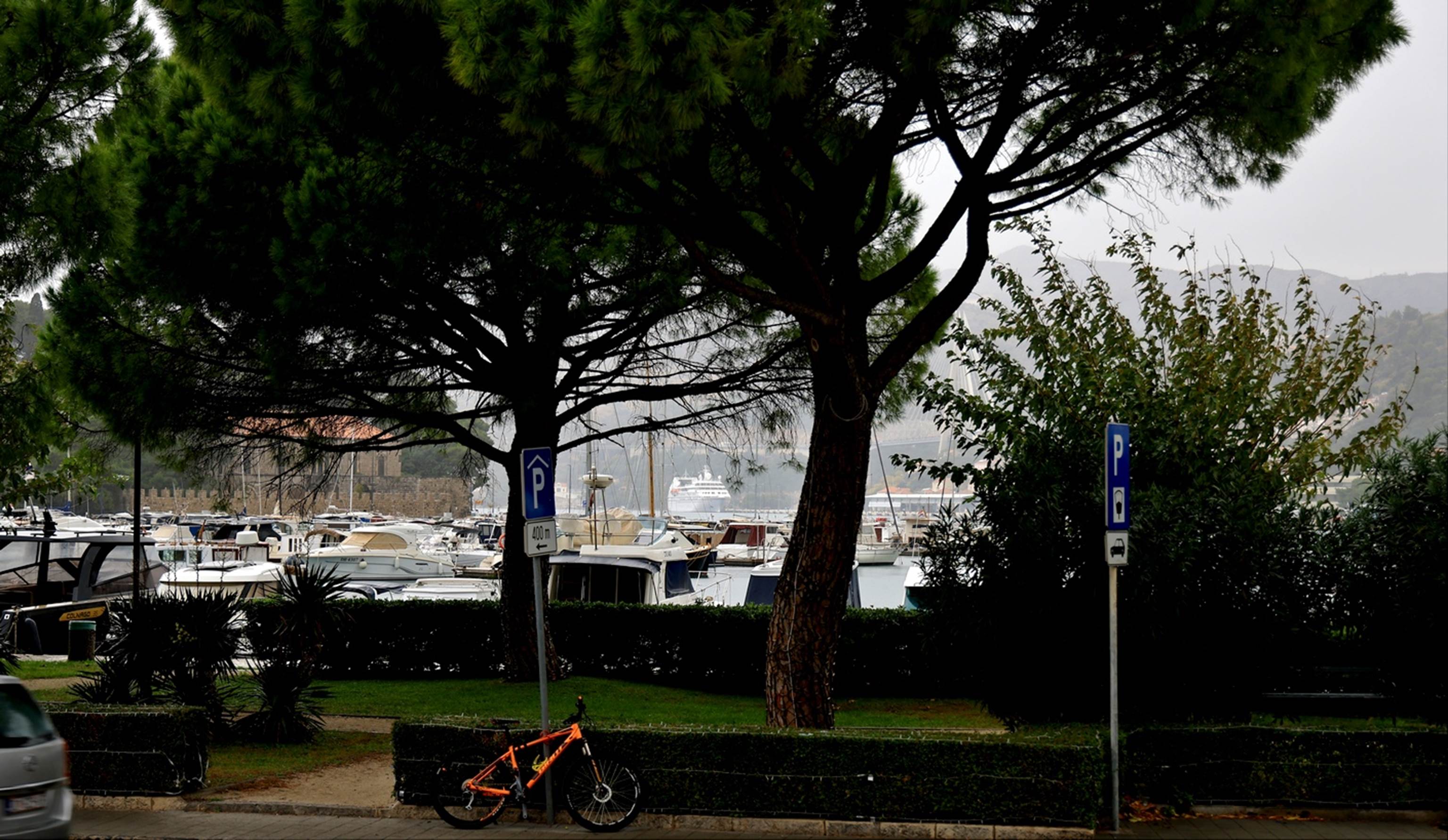 Tuesday morning we were still at the dock in Dubrovnik and would be here until leaving at 2:00 this afternoon. Since our visit to the old town was somewhat short in the previous day’s excursion, we considered taking the shuttle back over there for a better look around. A quick look outside, however, and we decided to stay close to the ship: it was raining again. We enjoyed a leisurely breakfast and then took a look outside: the rain had about stopped! While a return to the old town would still be rather risky, we thought we would be OK taking a walk around the harbor where the yacht was docked so we put on our rain resistant (not water-proof) jackets and headed out. Of course, as soon as we got a short distance from the yacht, the rain returned. Ever optimistic, we thought that it would not last long and, besides, it was not raining hard.