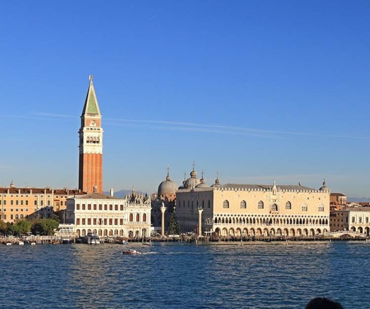 Looking back at St Marks Square, the Basilica San Marcos, and the Doges Palace