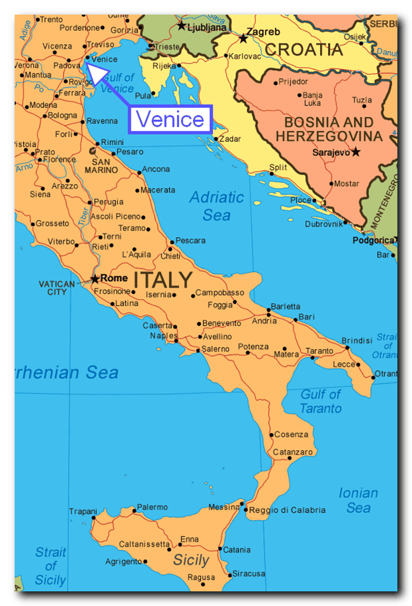 When we got up this morning, we were just a little outside of the entry to the Venice Lagune, with just enough time for a quick breakfast before we entered. There was a beautiful red sky on the horizon as the sun was coming up and I hoped that the old “Red sky at night, sailor’s delight. Red sky in the morning, sailor take warning.” saying did not hold today. We would really have two major activities today: first, we would enter and transit the Venice Lagune (or Lagoon) as a major sight-seeing activity then we would go on an excursion with the Doges Palace as the primary destination.