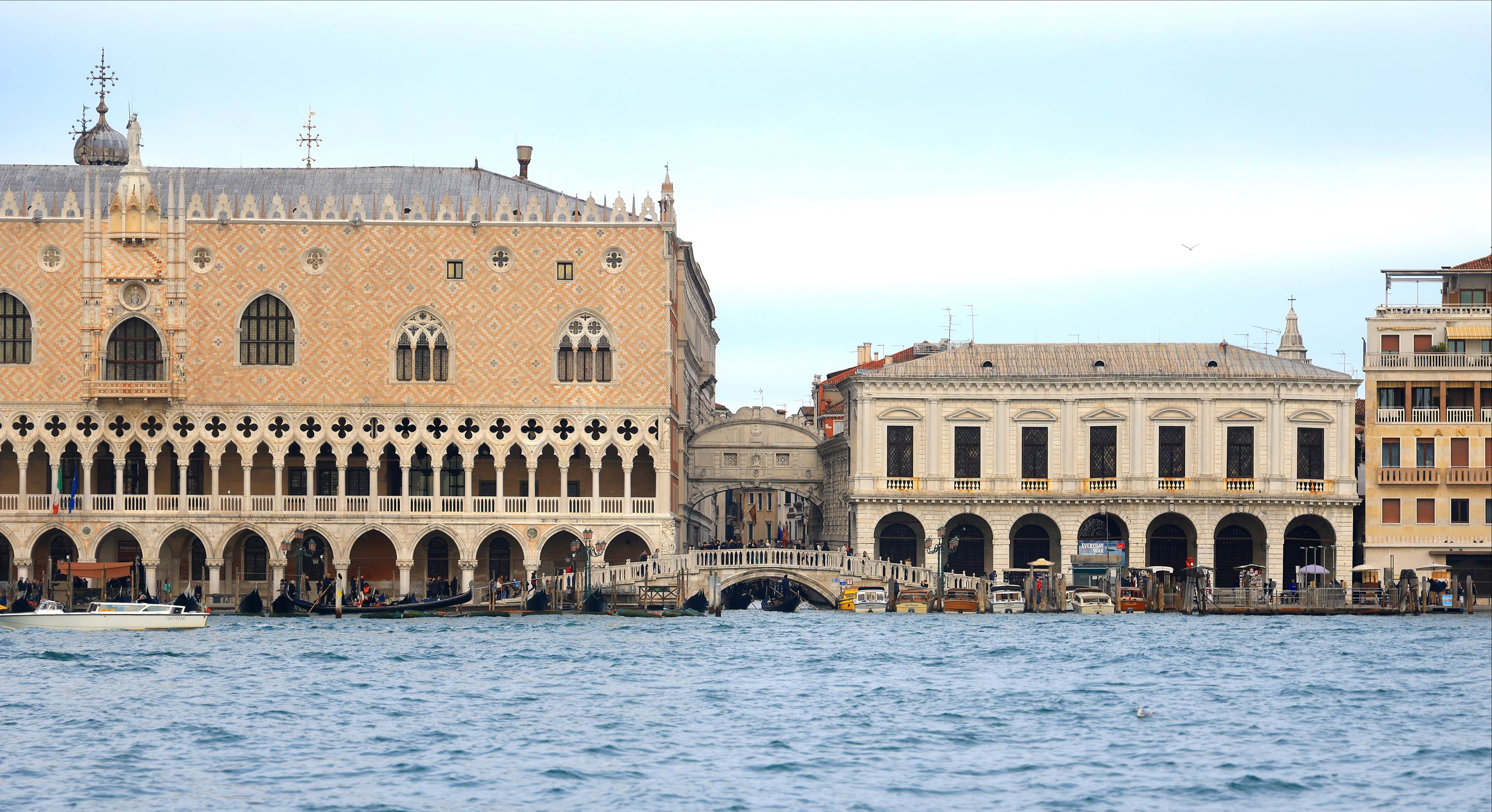 In the opposite direction from the Bridge of Sighs, you could get a very classic view of the Venice Lagune, complete with multiple gondolas floating at their moorings and San Giorgio Maggiore church on the other side of the lagune.