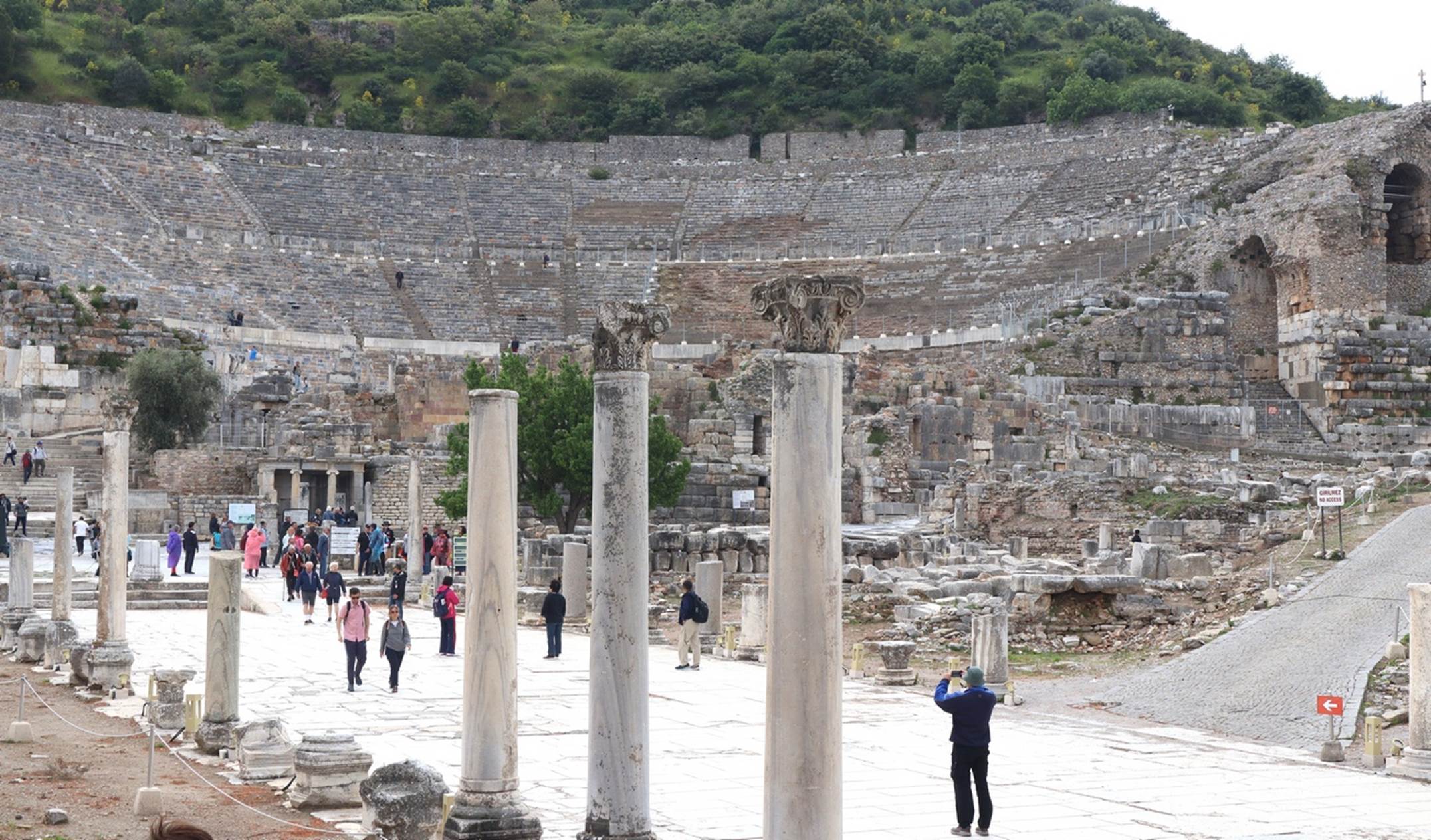 In the classical Greek period, the Aegean sea came within a kilometer of Ephesus and there was a large road leading from the Grand Theater to the harbor, thus the name “Harbor Road”. During the first couple of centuries AD, due to both natural and man-made problems, the bay filled with silt and became unusable for shipping, The Aegean shoreline is now about 5 kilometers away.