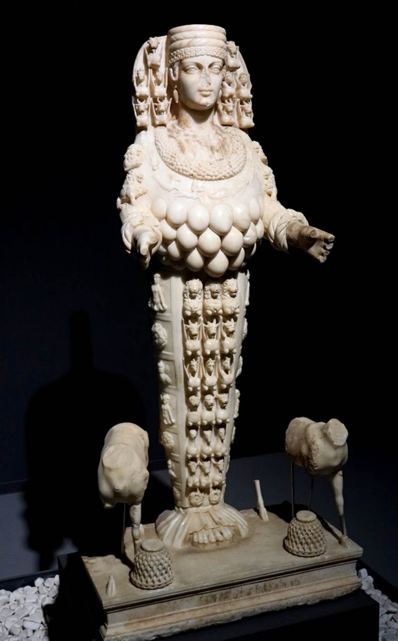 We passed through a commercial building with snack bars and souvenir shops and met up with our driver at this entrance to Ephesus. We headed back to the town where we had visited the Basilica of St John and went into the Ephesus Museum there. Much of the contents would not have meant very much without the good explanations of our guide. For example, the statue pictured below: