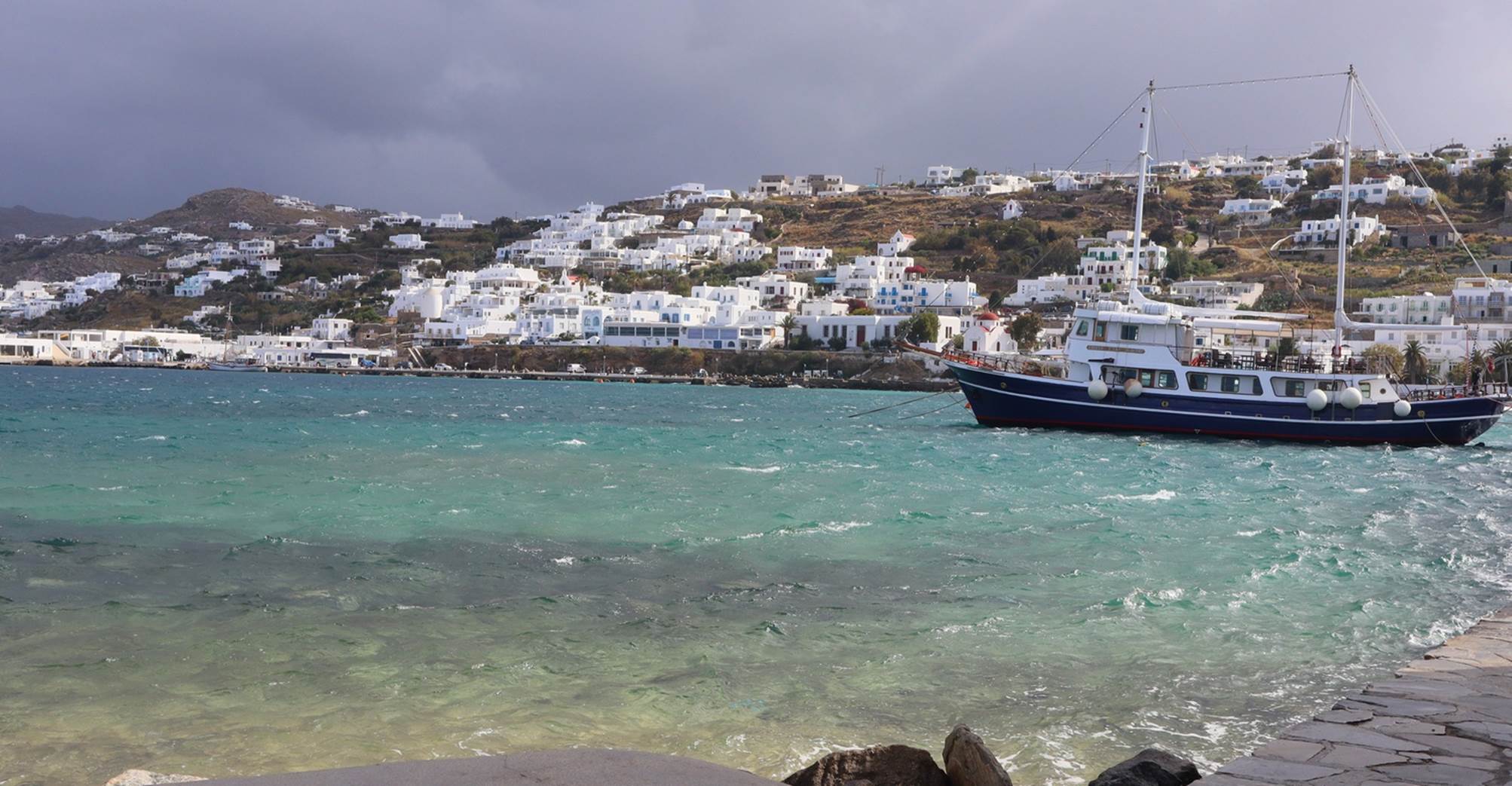The wind was still blowing strong here, of course, but the harbor faces the other direction, so the island provided protection from the wind and waves, and it was relatively calm here. Check this video and compare it to the one at Skepolos and you will see a major difference.
