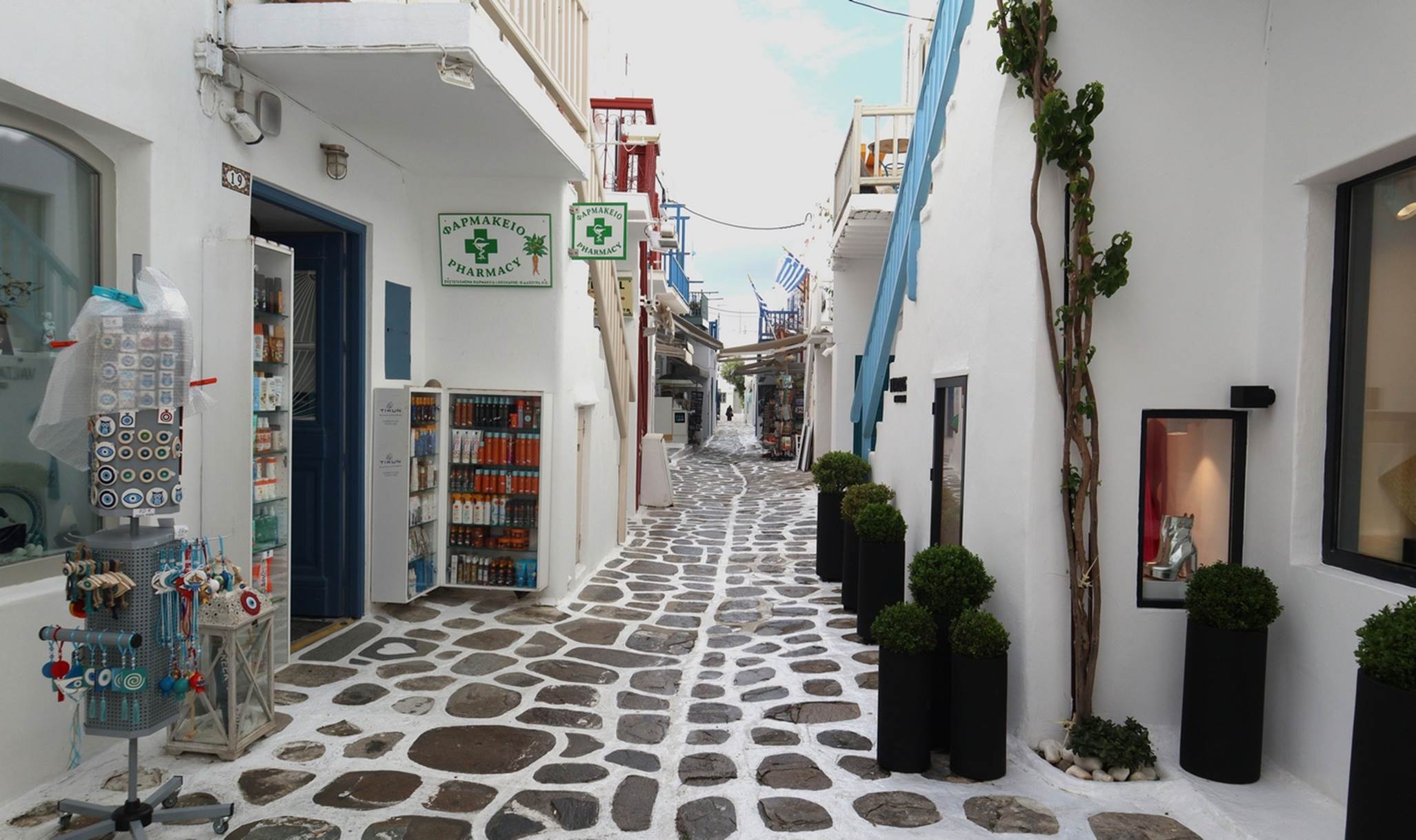 We looked around the shopping area close to the harbor for a while: the streets looked just like I imagined the streets on Mykonos should look.