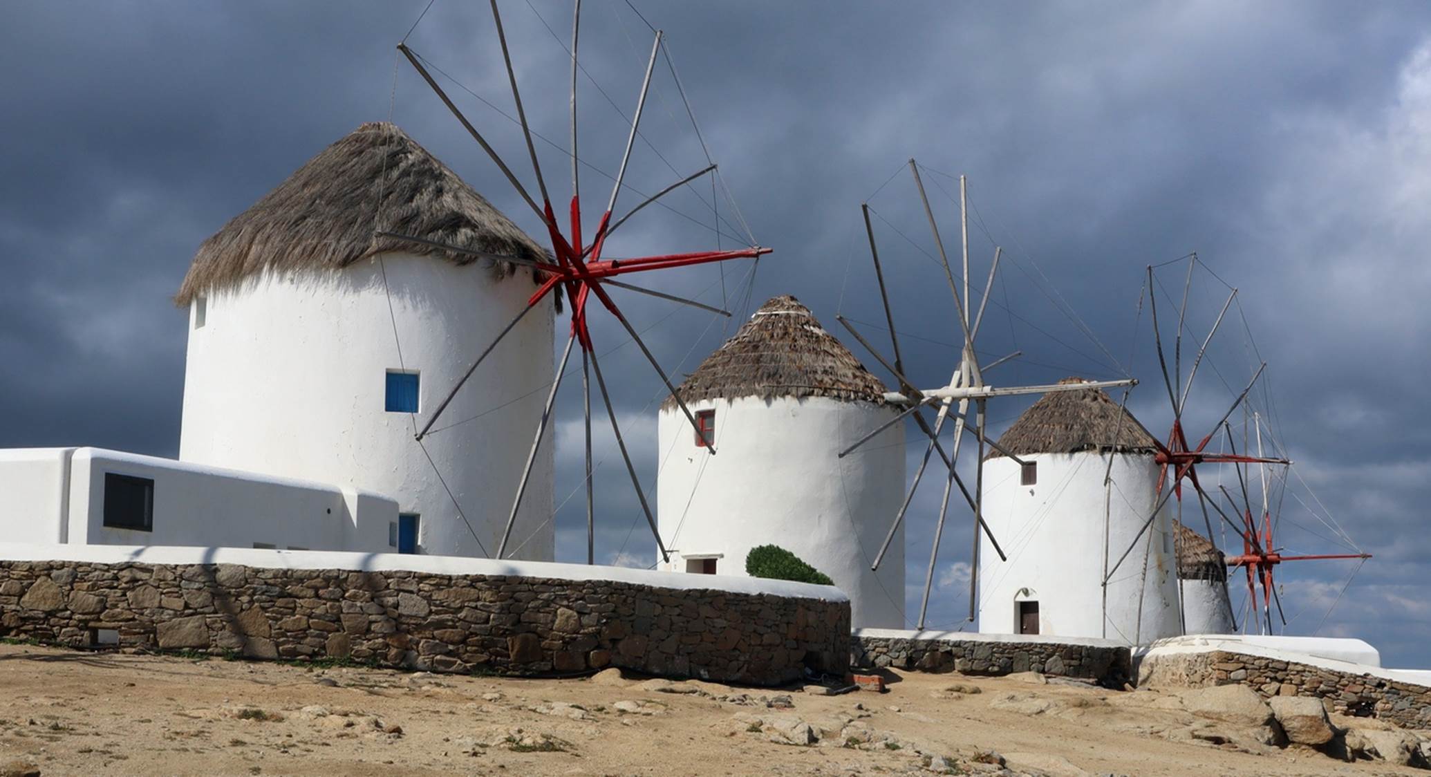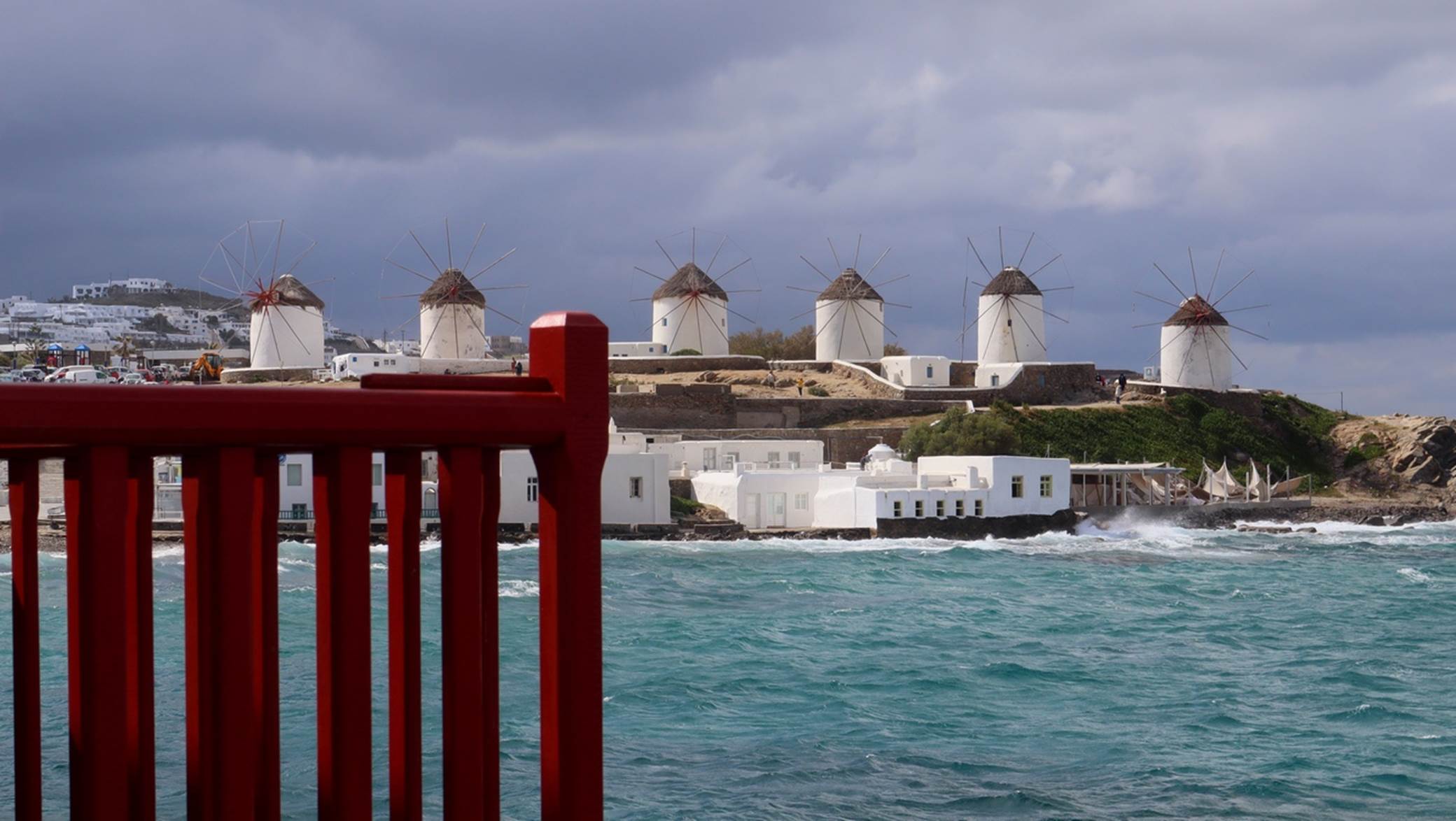 This day dawned with the wind blowing pretty good, probably 20 mph, and the threat of occasional rain showers. For some reason, there were very few excursions available for Mykonos and we had not signed up for any. We planned to just head into town and take a walk around and see what we could find. We were at anchor a little outside the harbor and the water was somewhat rough. Rather than using the Encore’s tenders, we were riding water taxi boats from the island and moving between the Encore and the water taxies was a little tricky with the rough water. It took a little while for the crew to decide just how they were going to handle loading and unloading the water taxies so we had to wait a little while to head ashore, but we ended up being some of the first passengers to get to Mykonos.