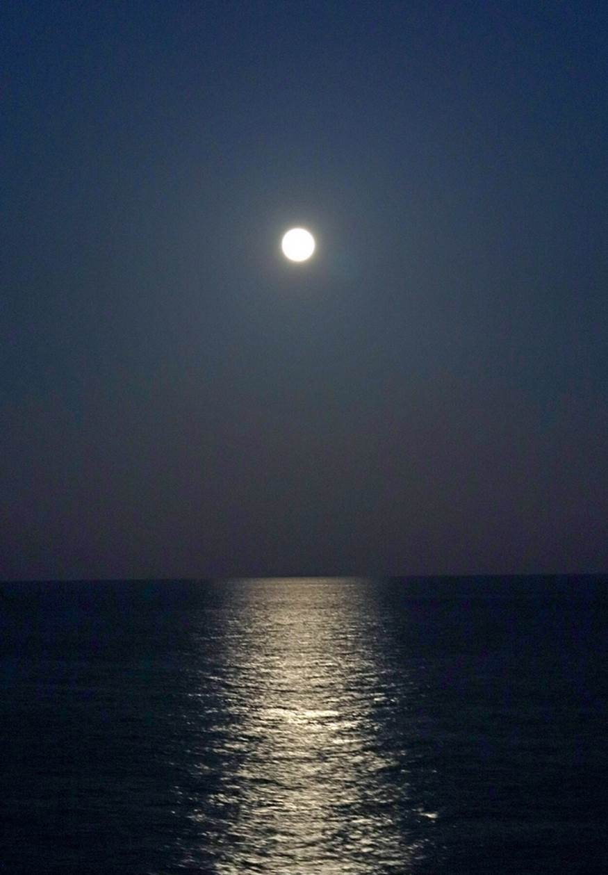 Dinner this evening was at the open-air Rooftop Grill and, as I mentioned earlier, this was probably the least successful dinner on the cruise. The sun was somewhat in our faces, although we requested a shaded table, and neither the food nor service were memorable. Even the photo I took of our table came out poorly. After dinner we did enjoy the full moon as it came up over the ocean.