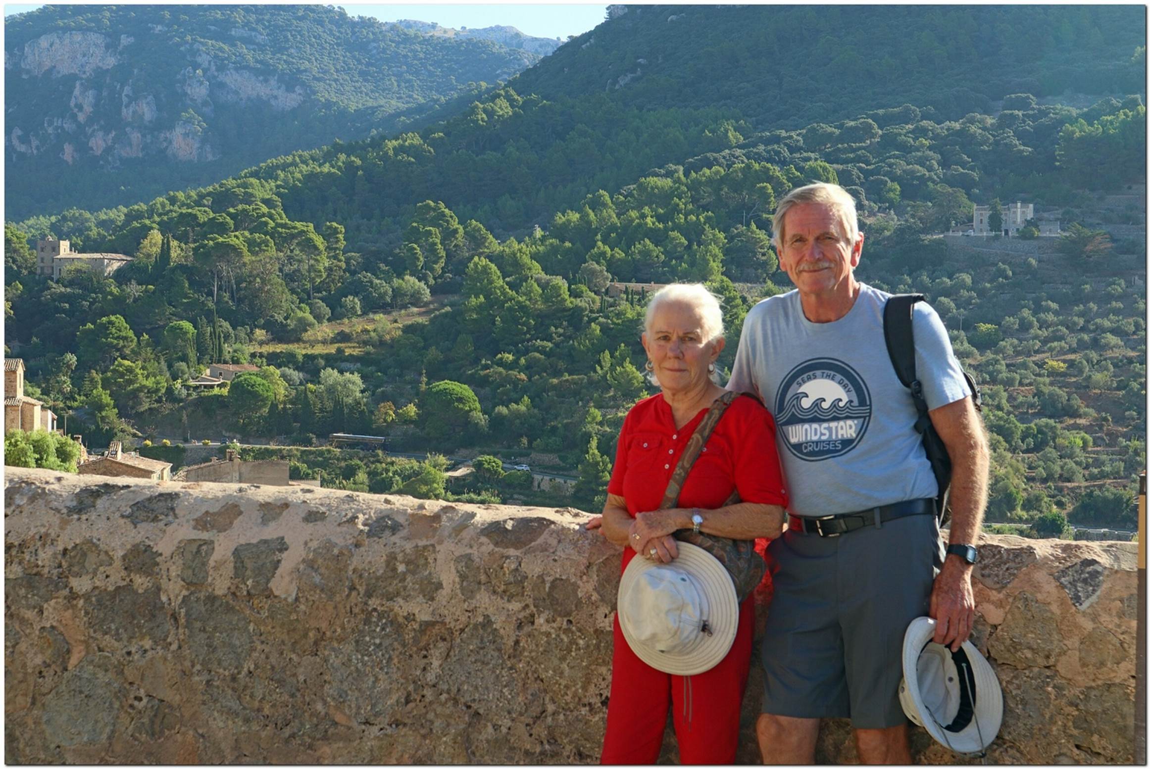 Today we had what was essentially a sightseeing tour, visiting two towns: Soller and Valldemosa. Palma is on a large bay on the southern coast of Mallorca and Valldemosa is a few miles inland from the western coastline, while Soller is a harbor town on that coast. We boarded a tour bus (probably about 30 people) and headed out for the 45-minute drive to Valldemosa. As we approached the town, we got a good view of Valldemosa from the bus.