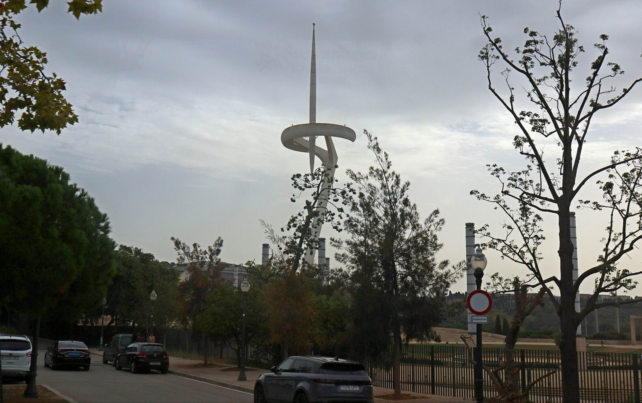 We had to kill about 15 minutes in the station while Andrea found our bus and got it into position where we could board it, but soon we were on our way. We did not go directly to our hotel, but instead took a brief tour of part of Barcelona, including the site of the 1992 Olympics and a hill overlooking Barcelona. From the bus, I took a photo that turned out to have a lot of history in it.