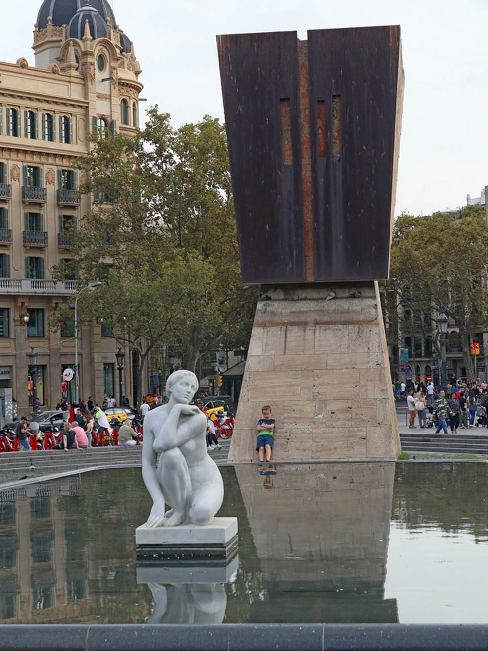 We continued walking up Las Rambles to the Placa de Catalynua, a large plaza and square considered to be in the center of the city, with several fountains and monuments. There were many people milling around and a couple of people were exploring the water around the fountains. In the southern corner of the plaza is a sculpture of La Deessa (The Goddess) in front of a stone monument.
