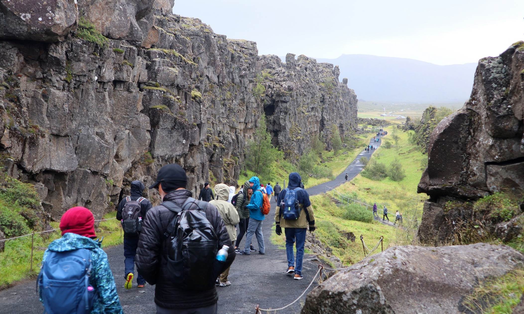 We had a fairly early departure time for our “Golden Circle” tour, so we got a quick breakfast in the Veranda and then met the other touring people in the lounge. Kuba, the Destination/Excursions manager, would be joining us because he had not been on a Golden Circle tour yet. The Star Pride does not usually spend a normal day in the Reykjavik port and he wanted to understand what the tour covered. There were about 35 of us on the tour so we loaded on the bus and headed out. Our first stop was about an hour away, at the Thingvellir National Park. The unique thing about this area is that this is where two tectonic plates (the North American plate and the Euro-Asian plate) come together. Actually, this is where they come apart as the plates are moving away from each other. As the plates separate, the new space is filled in by magma/lava from below and top-soil from the surface. The plates move apart less than an inch each year so it is a very gradual process, but minor earthquakes are almost a daily affair in the area.
