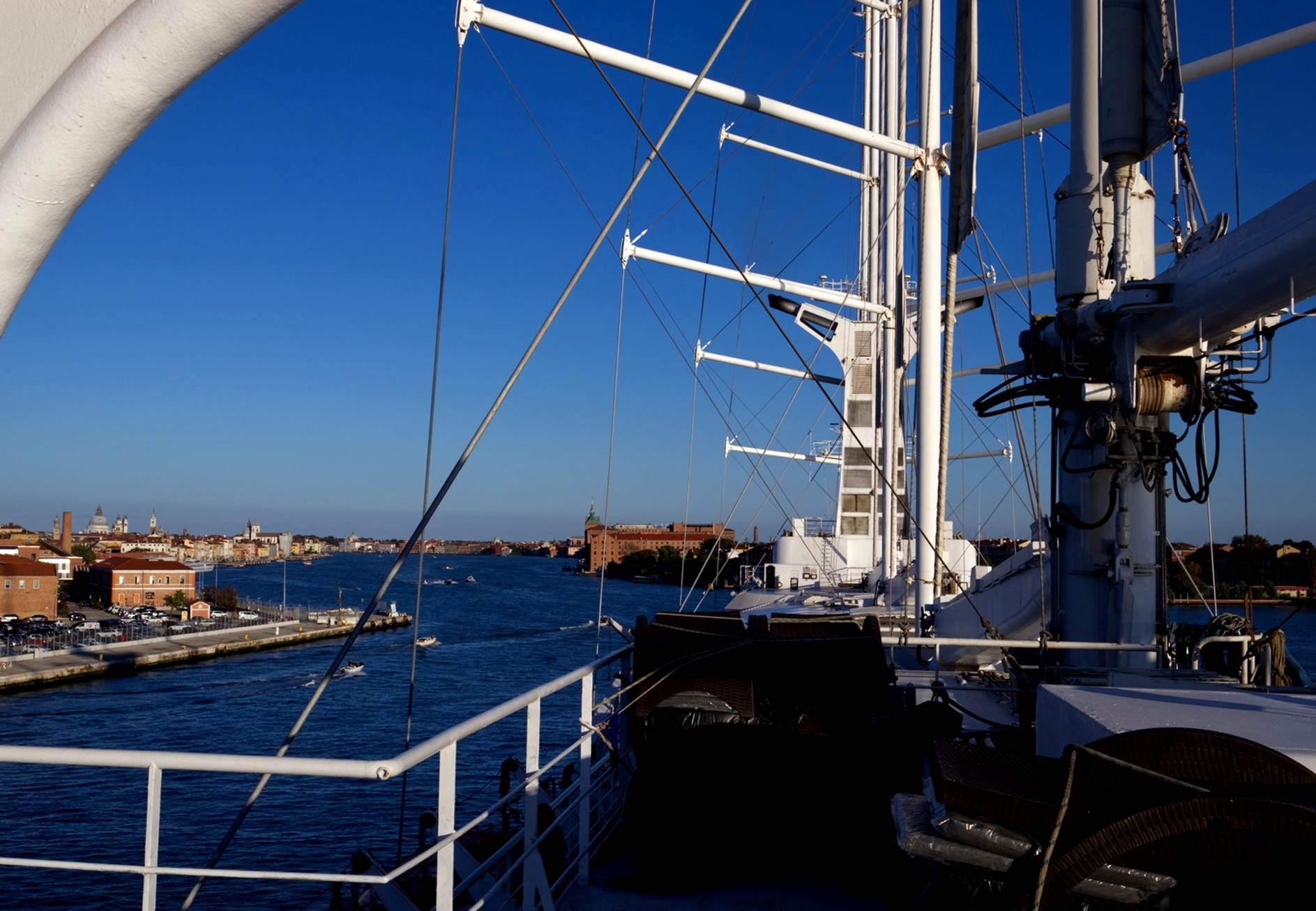 As we motored past the main part of Venice, there were many people along the waterfront watching us go by. I’m sure that other, much larger, ships have made this trip in the past, but the Wind Surf is a rather unique ship and probably the first significant size ship to make that journey in over a year.