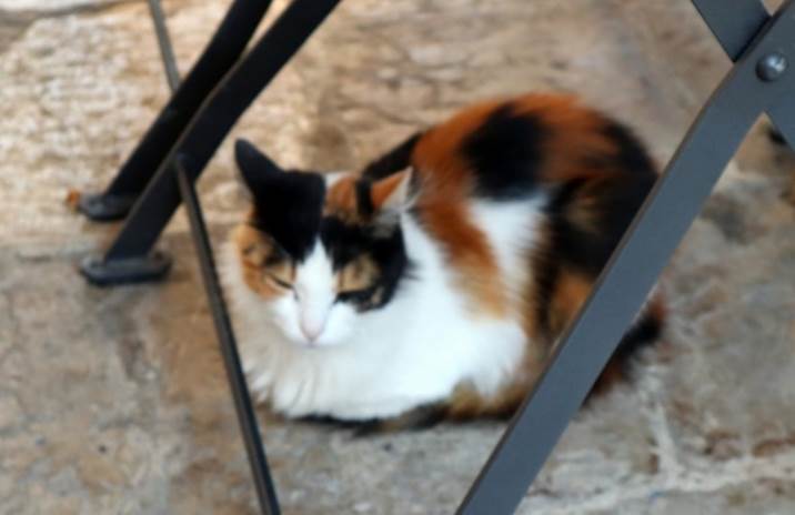 A couple provided local music entertainment while we enjoyed our “snack”. The resident cat had come to see us during lunch and after we finished and went outside, she was there to greet us again. Of course, Susan could not resist the invitation to pet her a bit.