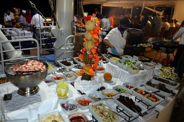 We left the water taxi, grabbed our luggage, and headed toward the building where we would complete some paperwork and board the ship. One thing we had to do was take another COVID-19 test. This was a rapid test so it only took about 10 minutes for the results and we were allowed to board the ship. Once onboard, we found our cabin and settled in a bit, then headed for the Veranda restaurant for some lunch. The Veranda is used for breakfast and lunch and is set up for self-service buffet dining. But, in this age of COVID, self-service is not allowed, so ship staff did all the serving. You could request whatever you wanted but the staff had to actually serve the food onto your plate. It was a bit inconvenient for both staff and passengers, but that is the way it was to be.