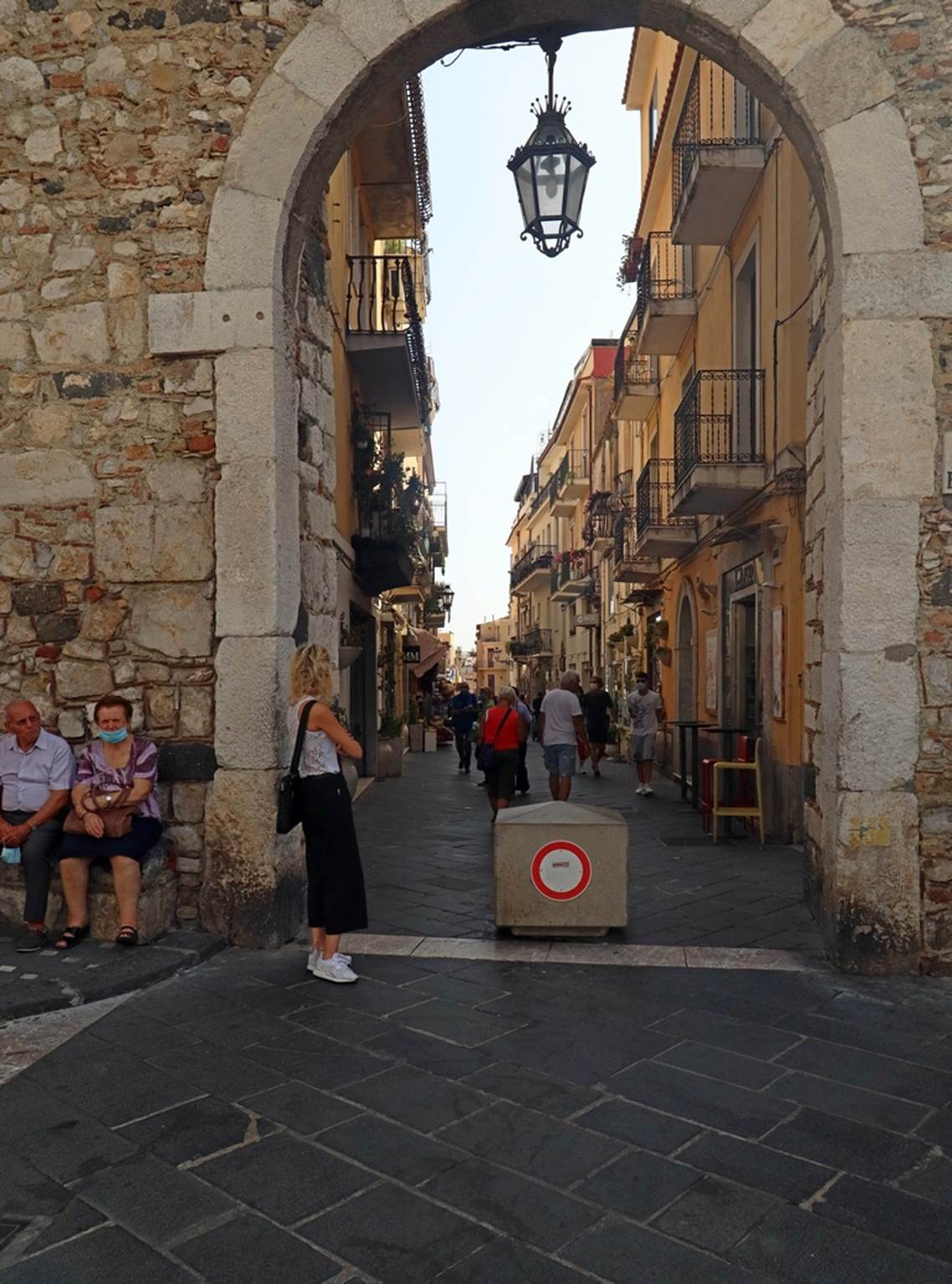After having a good look around, we headed down the mountain to Taormina, a large town (or small city) largely from Medieval times, but with some older Roman structures. Most of the main part of the town is limited to pedestrian traffic only, so our bus driver let us out and we started walking.