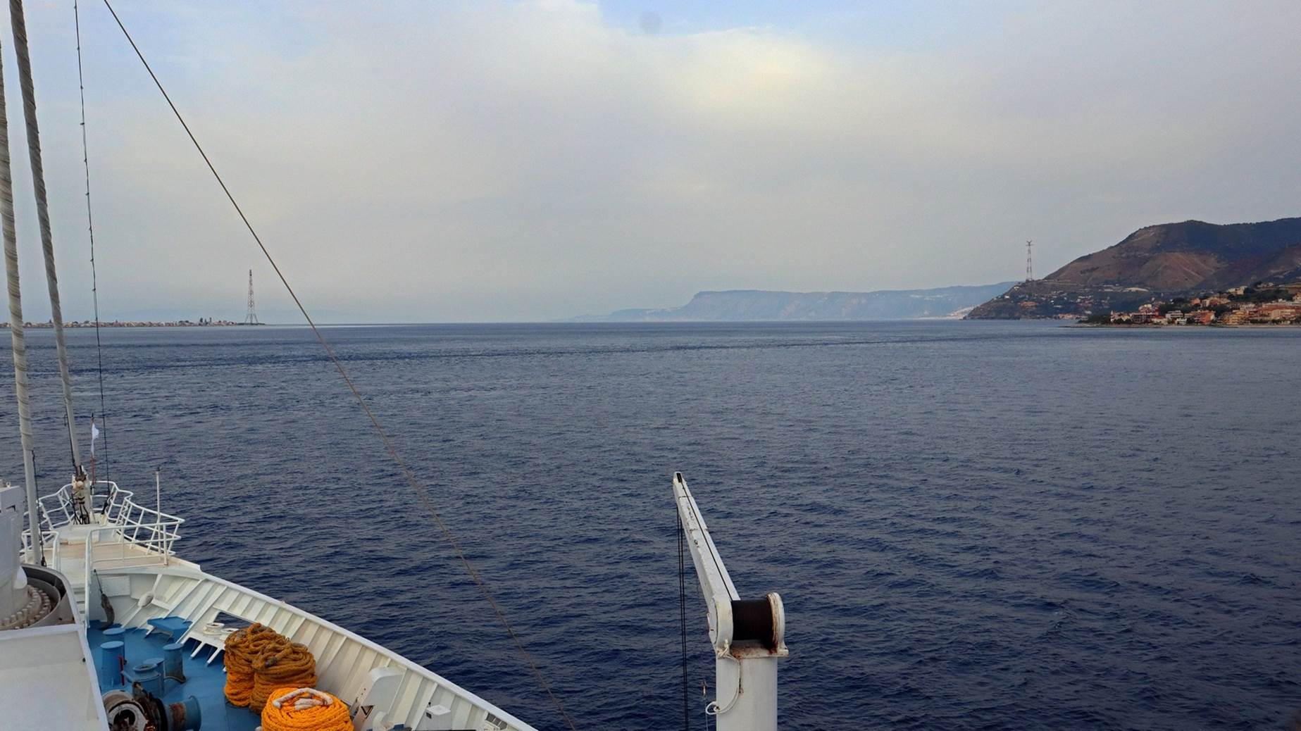 As I mentioned earlier, Taromina is about 30 miles south of Messina and the strait of Messina where Sicily comes within a couple of miles of the toe of Italy. We got to the straight just a little before sunset and it was interesting to watch as we approached the narrow strait. I was expecting to see a fair amount of ship traffic through the strait, but, as you can see in this video, we were the only ship in sight.